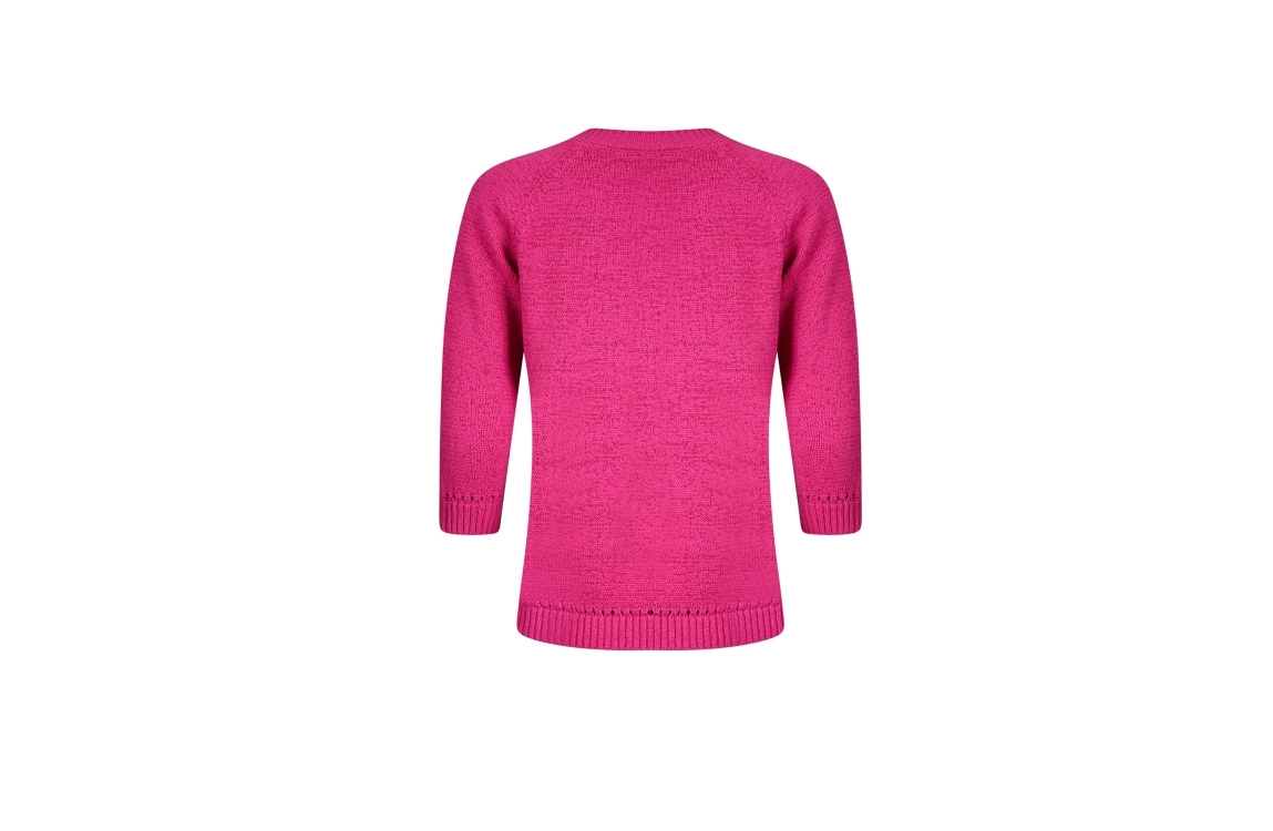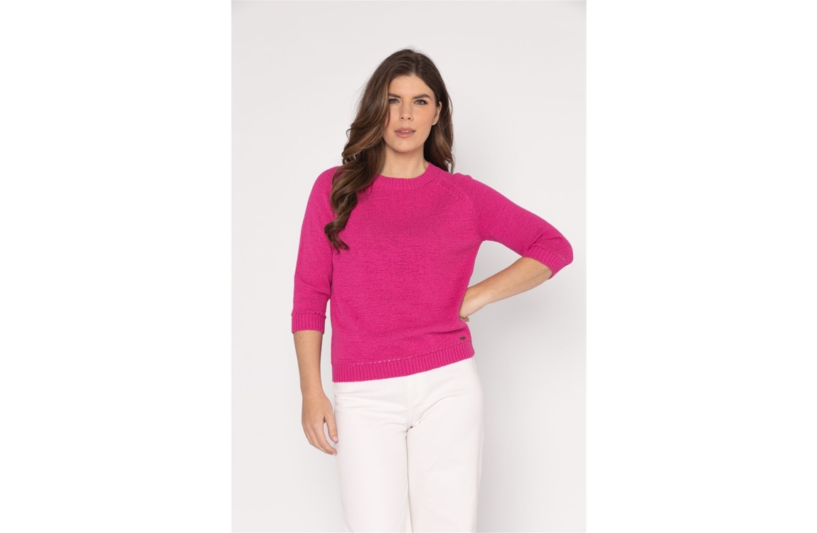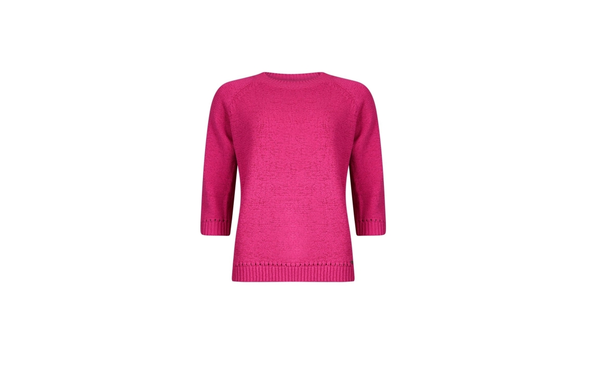 Roberto Sarto pullover 611198. Dit rechtvallende model is voorzien van een ronde hals en heeft driekwart mouwen. Deze fuchsia kleurige gebreide pullover van Roberto Sarto is afgewerkt met ribgebreide boorden.