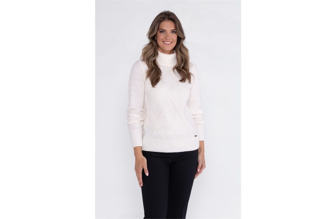 Roberto Sarto trui 531117. Dit wijdvallende model is voorzien van een col en heeft lange mouwen. Deze off white kleurige trui van Roberto Sarto is aan de voorzijde voorzien van een ruitmotief en is afgewerkt met ribgebreide boorden.