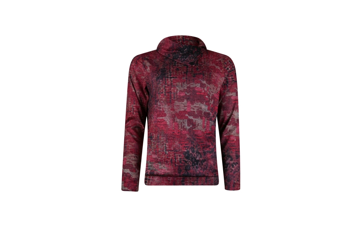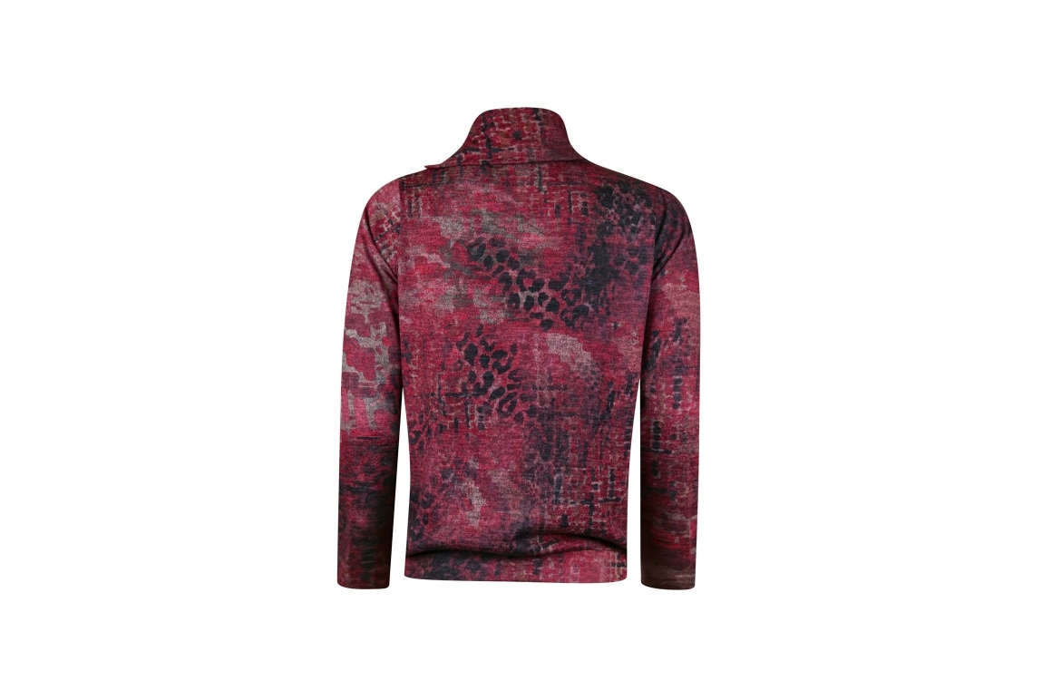 Roberto Sarto pullover 531183. Dit rechtvallende model heeft een asymmetrische col met knopen en lange mouwen. Deze rode pullover van Roberto Sarto is all-over bewerkt met een grafische print in verschillende tinten en is uitgevoerd in stretchkwaliteit.
