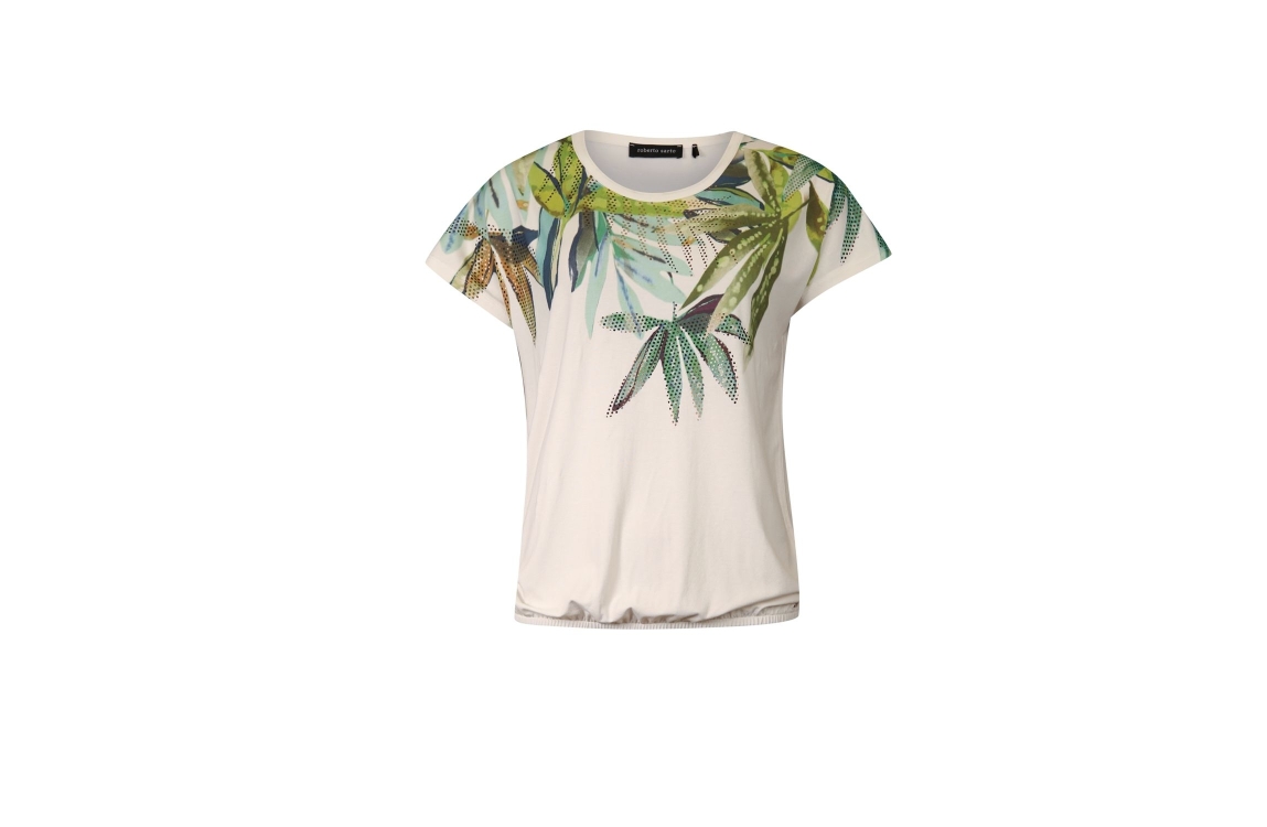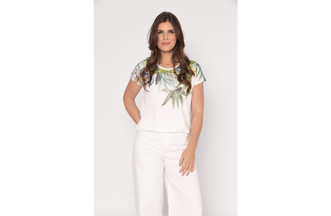 Roberto Sarto T-shirt 611086 1862. Dit rechtvallende model heeft een ronde halslijn en korte, afgekapte mouwen. Deze witte T-shirt van Roberto Sarto is op het voorpand bewerkt met een grafische print in verschillende kleuren en is uitgevoerd in stretchkwaliteit.