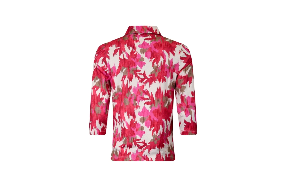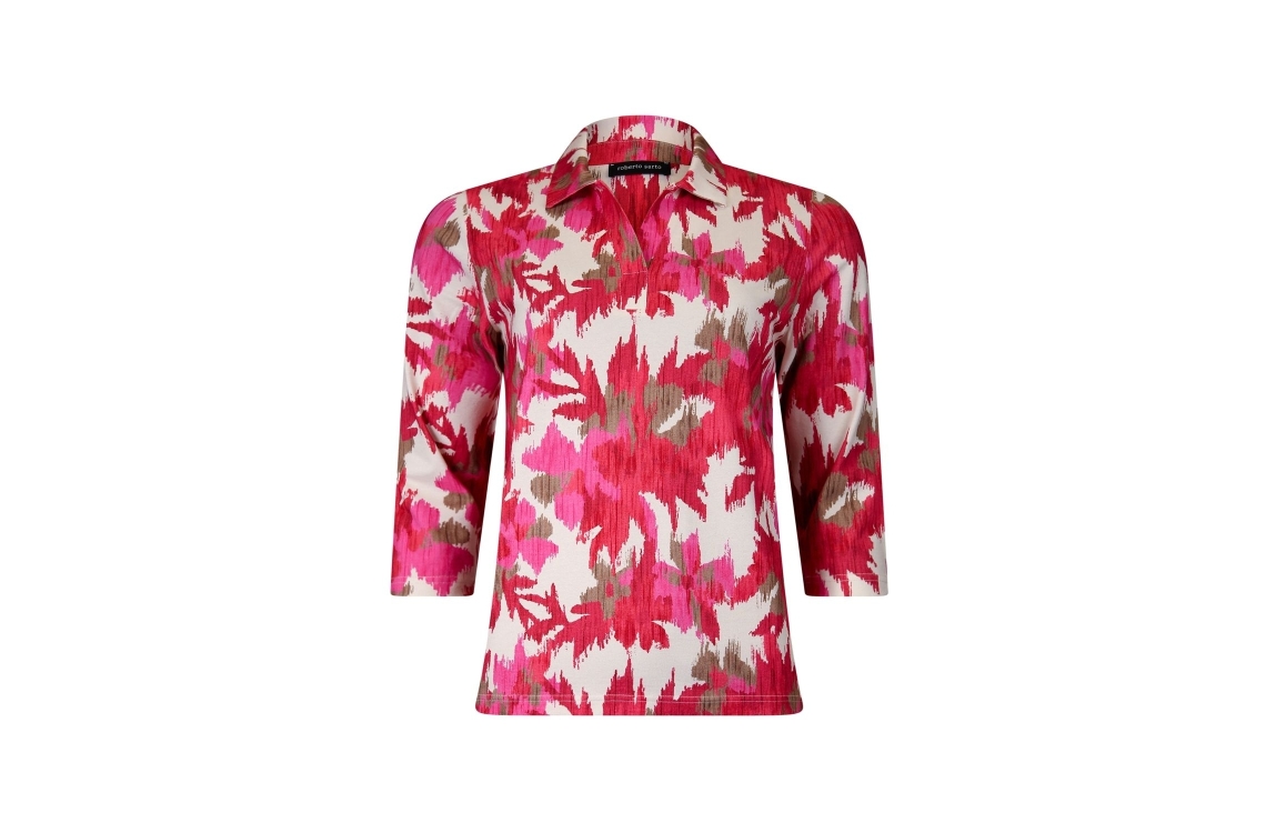 Roberto Sarto t-shirt polo 611187. Dit rechtvallende model is voorzien van een kraag en heeft driekwart mouwen. Dit roze/bruin/witte t-shirt polo van Roberto Sarto is bewerkt met een all over grafische print.