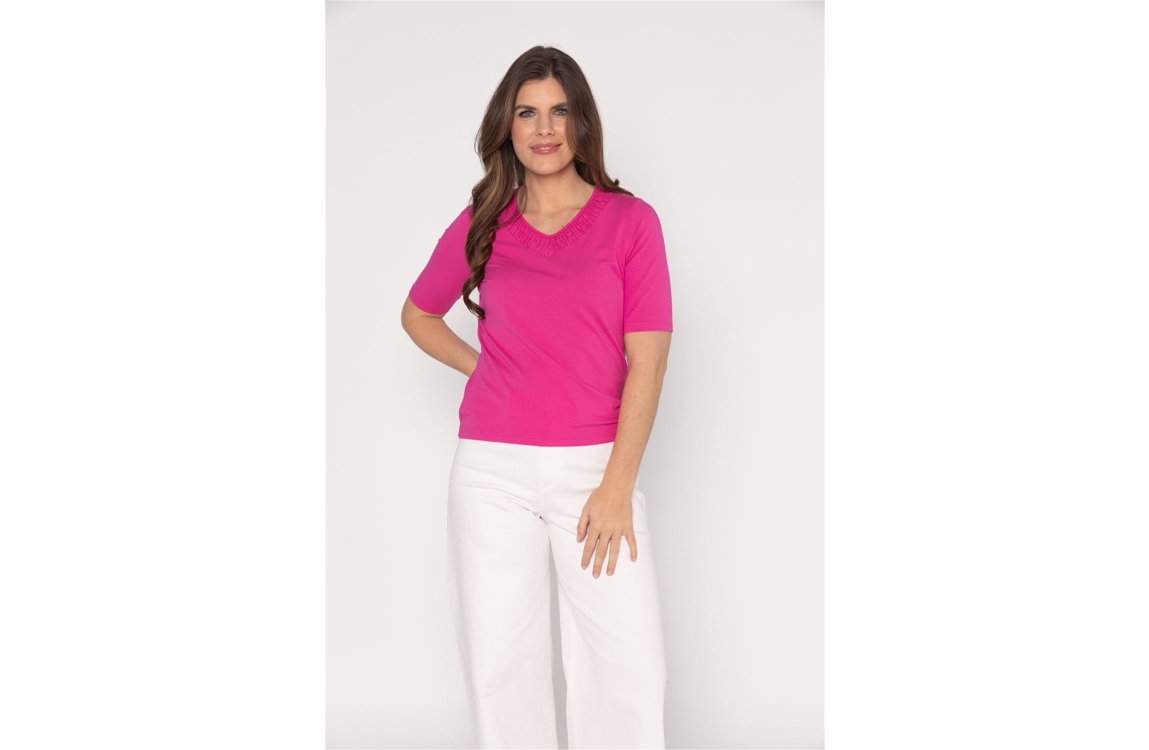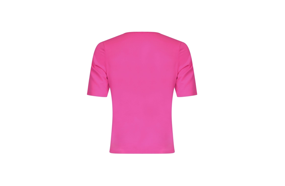 Roberto Sarto t-shirt 611124. Dit rechtvallende model is voorzien van een V-hals en heeft korte mouwen. Dit roze t-shirt van Roberto Sarto is aan de voorzijde rondom de hals bewerkt met een motief.