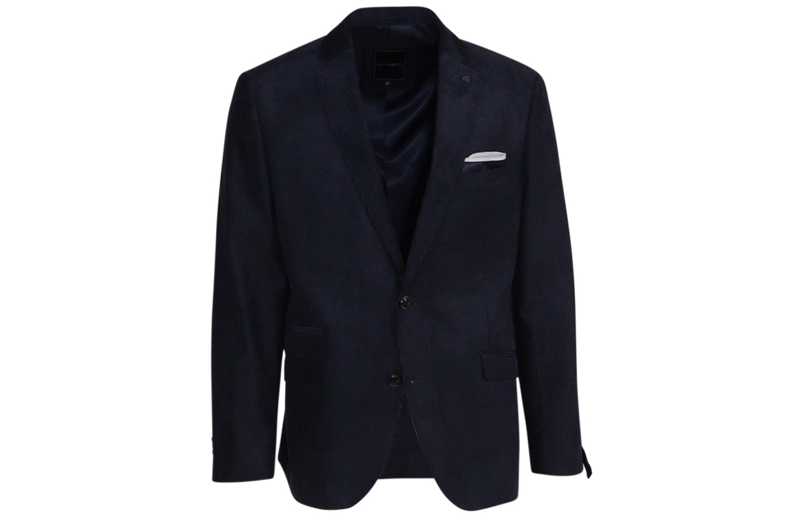 Scotland Blue colbert. Dit regular fit model heeft lange mouwen en is doormiddel van knopen te sluiten. Dit blauwe colbert ven Scotland Blue is afgewerkt met een borstzakje