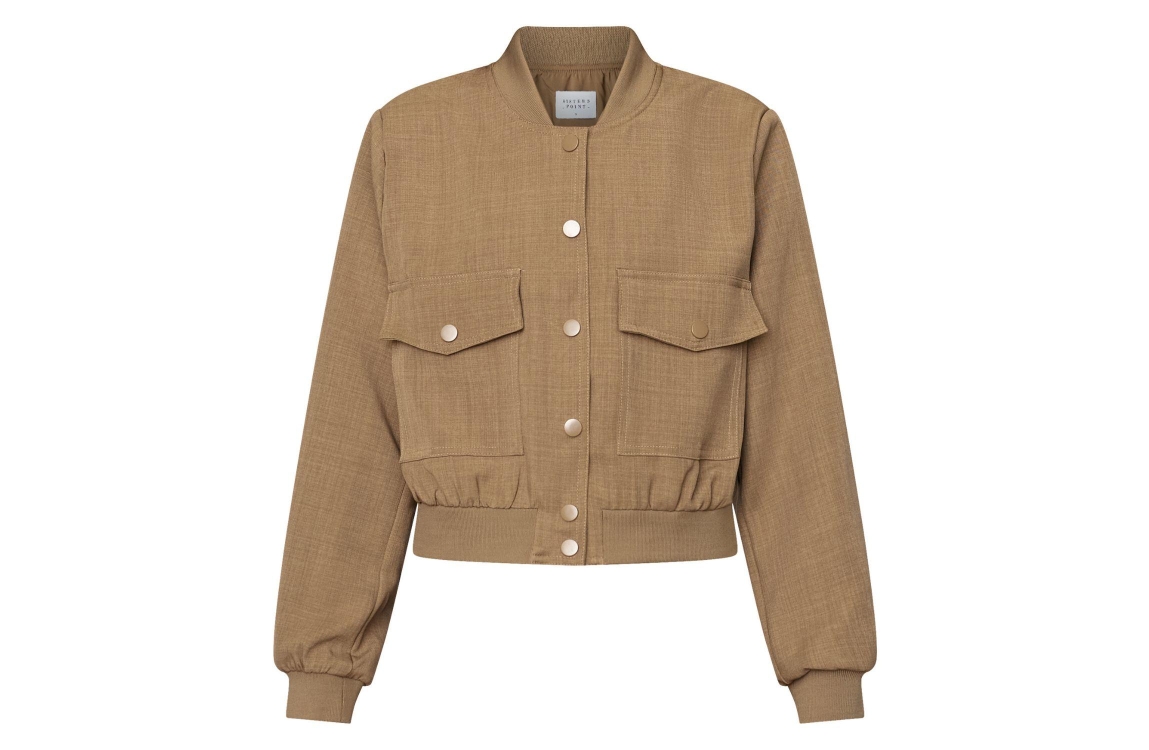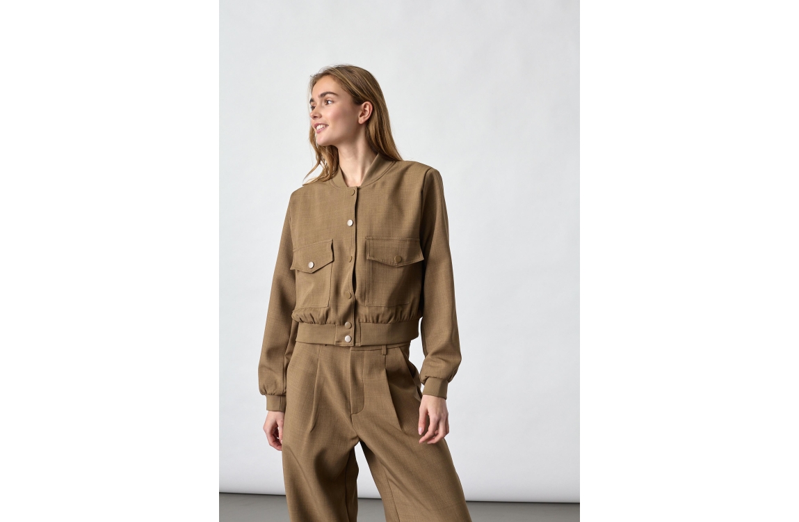 Sisters Point Blazer 205 Sand. Dit rechtvallende model is voorzien van een ronde hals en heeft lange mouwen. Dit bruin/beige bomberjasje van Sisters Point sluit door middel van knopen aan de voorzijde en heeft twee klepzakken. Dit model is afgewerkt met brede, geribde elastische boorden.