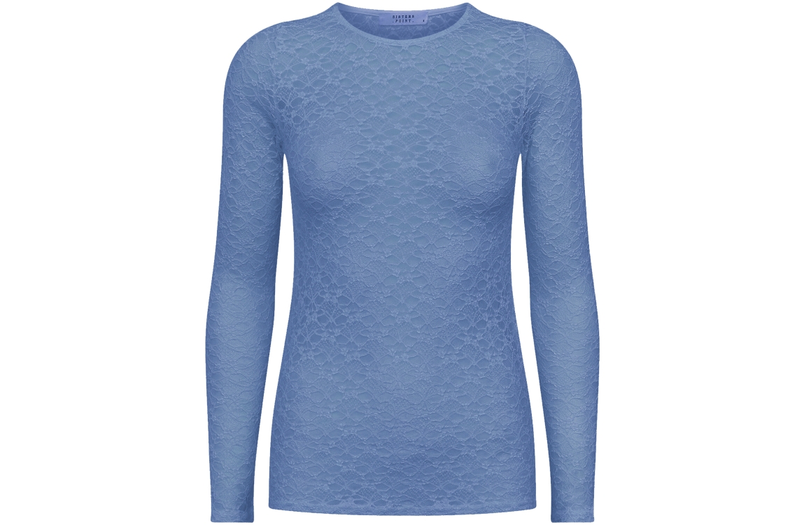 Sisters Point top GIMAS 402. Dit aangesloten model is voorzien van een ronde hals en heeft lange mouwen. Deze blauwe top van Sisters Point is uitgevoerd in kant.