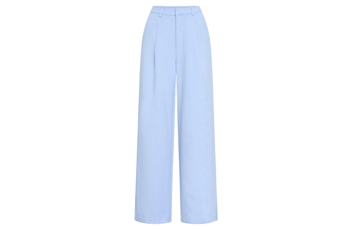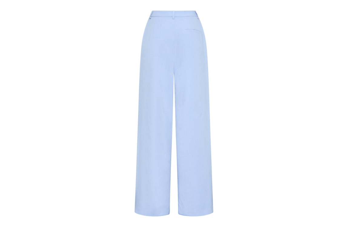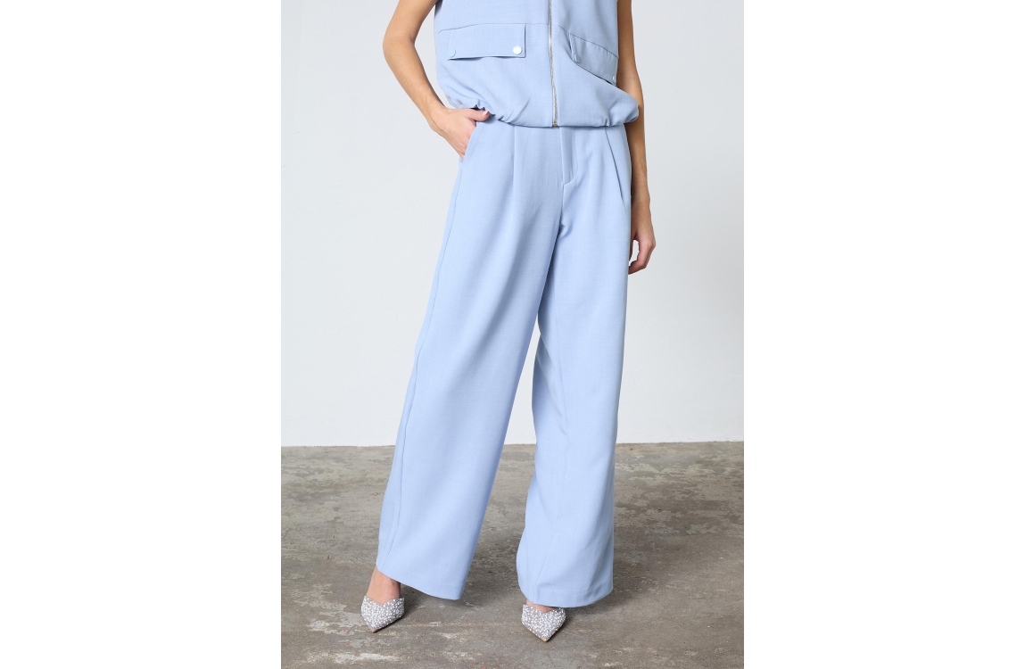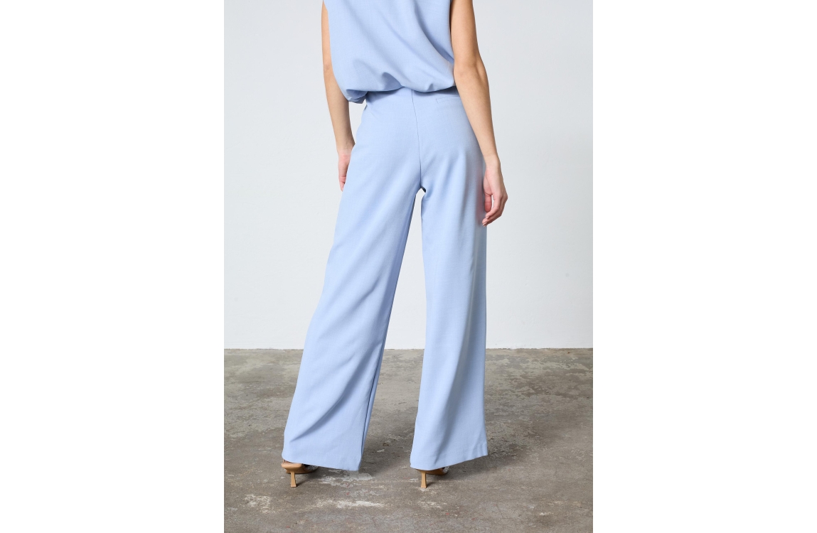 Sisters Point Pants 412 Skyway. Dit wide leg model sluit door middel van een haak- en oogsluiting en een rits. Deze licht blauwe broek van Sisters Point is voorzien van plooien aan de voorzijde en zijzakken.