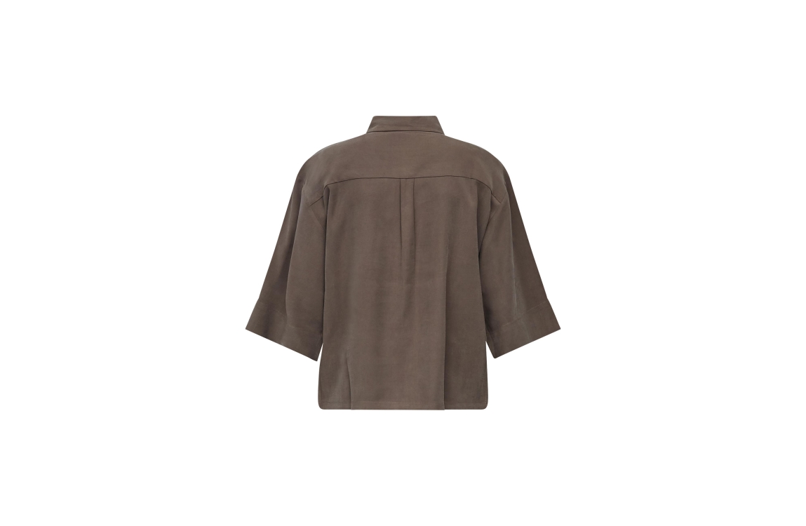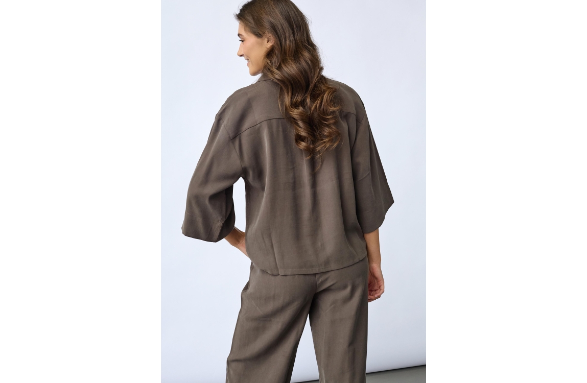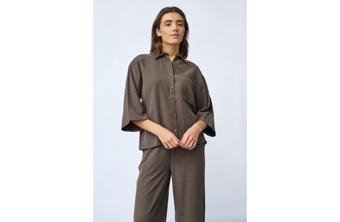 Sisters Point Shirts 225 Dark Earth. Dit soepelvallende model is voorzien van een kraag en heeft korte mouwen. Deze bruine blouse van Sisters Point sluit aan de voorzijde door middel van knopen en is afgewerkt met een borstzakje.