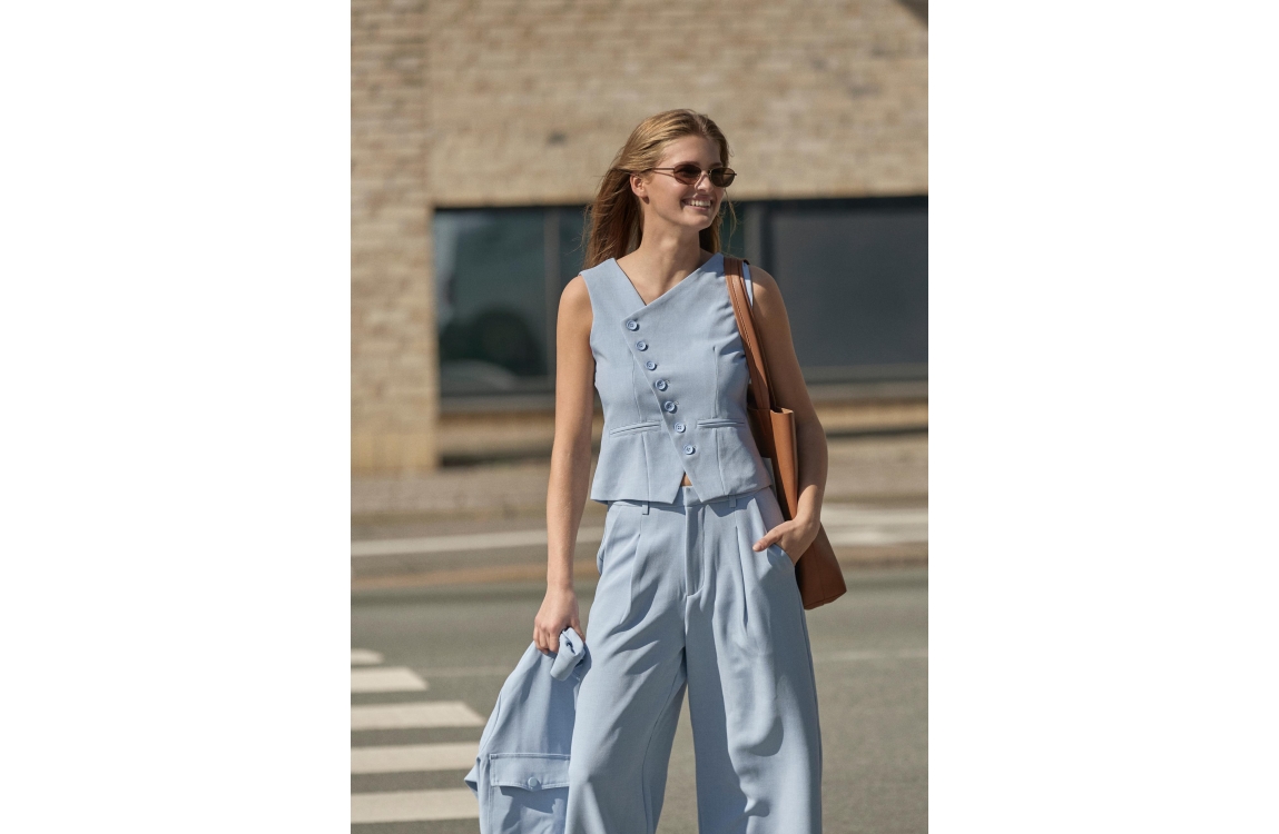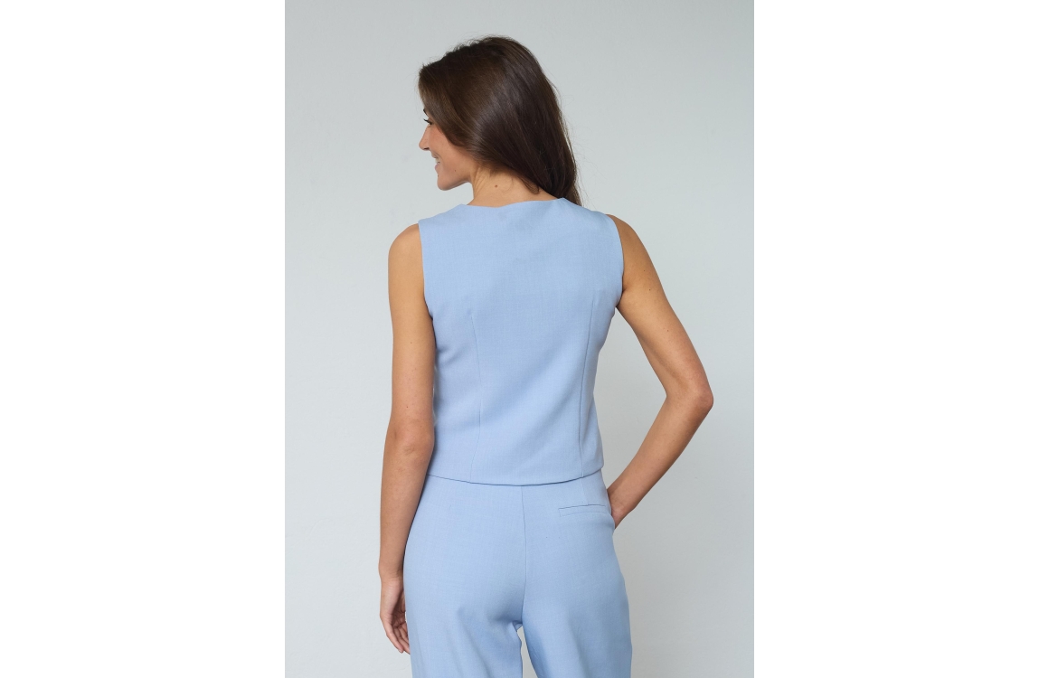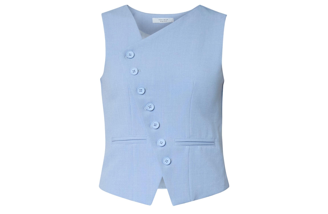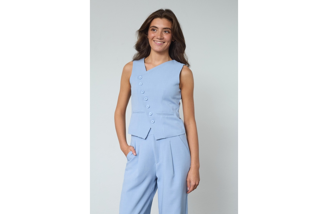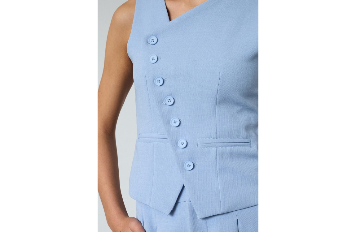 Sisters Point Vest 412 Skyway. Dit rechtvallende model is voorzien van een ronde hals en is mouwloos. Dit licht blauwe gilet van Sisters Point sluit door middel van knopen aan de voorzijde.