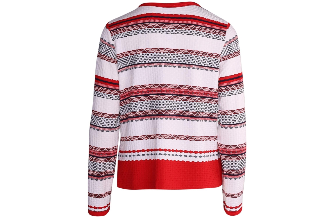 Sommermann jasje Cassandra 4554-11. Dit rechtvallend model heeft een ronde hals en lange mouwen. Deze rode jas van Sommermann sluit aan de voorzijde door middel van een rits en is all-over bewerkt met verschillende patronen en kleuren. Dit model beschikt over twee schuine steekzakken aan de voorzijde.