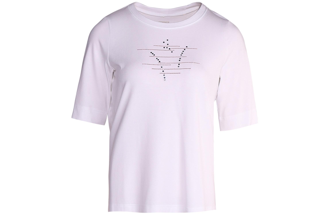 Sommermann T-shirt Heike 5513-31. Dit rechtvallend model heeft een ronde hals en korte mouwen. Deze witte T-shirt van Sommermann is aan de voorzijde bewerkt met strass-steentjes en bevat veel stretch.