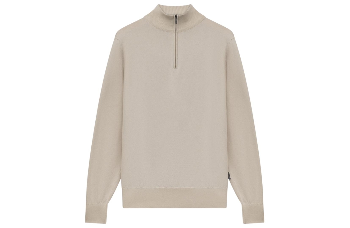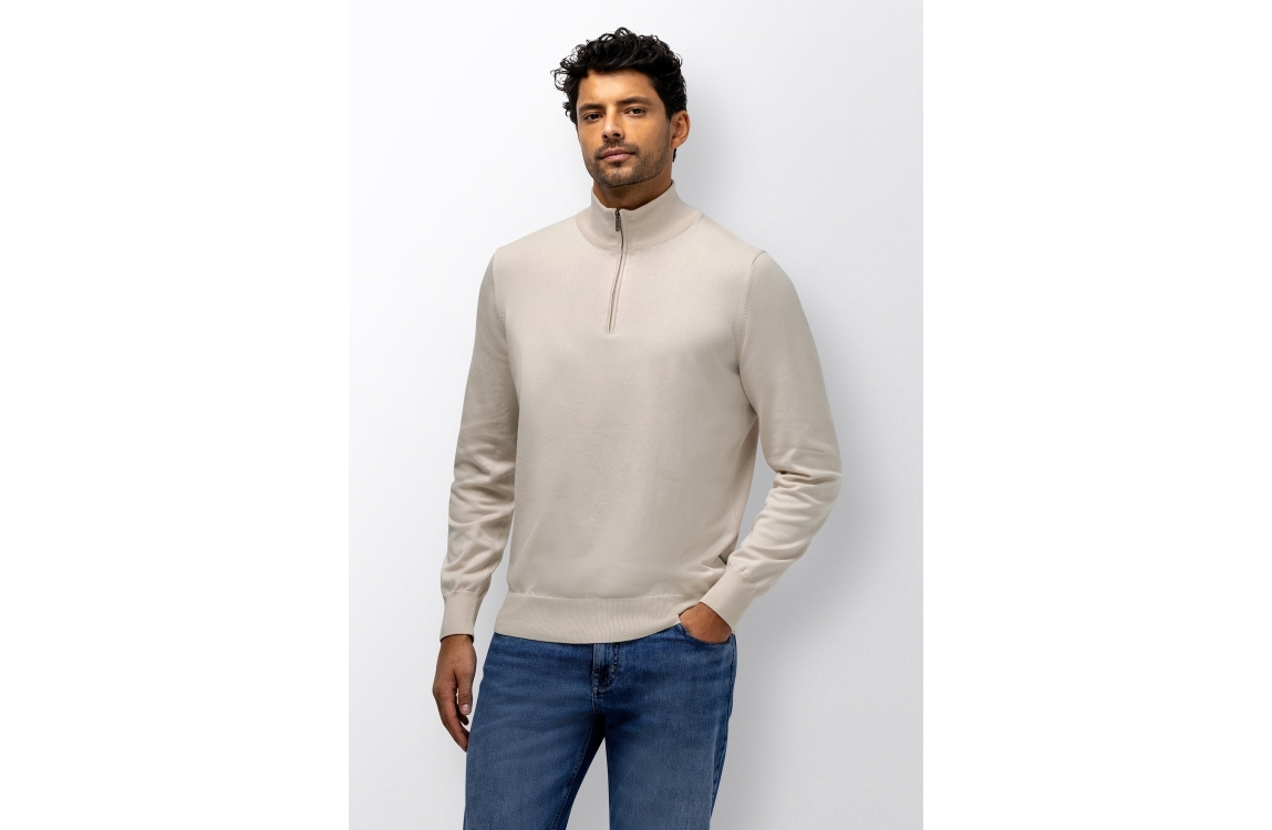 State of Art pullover 13116121. Dit rechtvallend model heeft een opstaande kraag met rits en lang en mouwen. Deze beige pullover van State of Art is voorzien van elastische boorden aan de onderzijde.