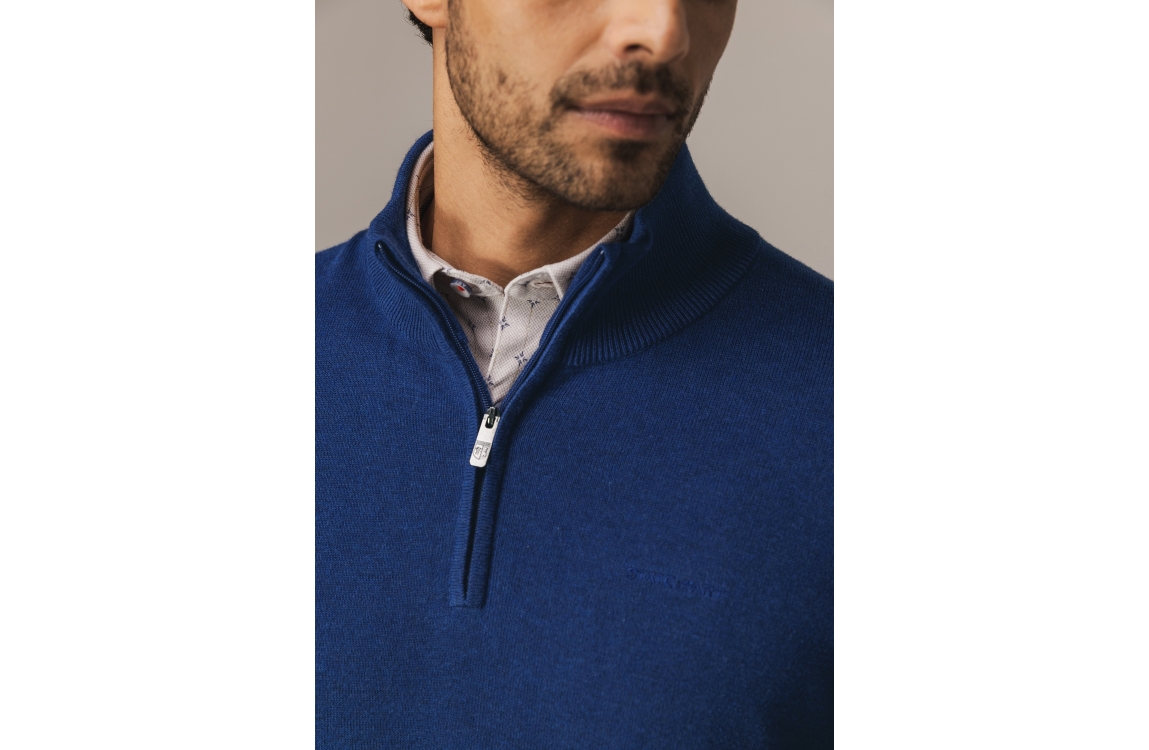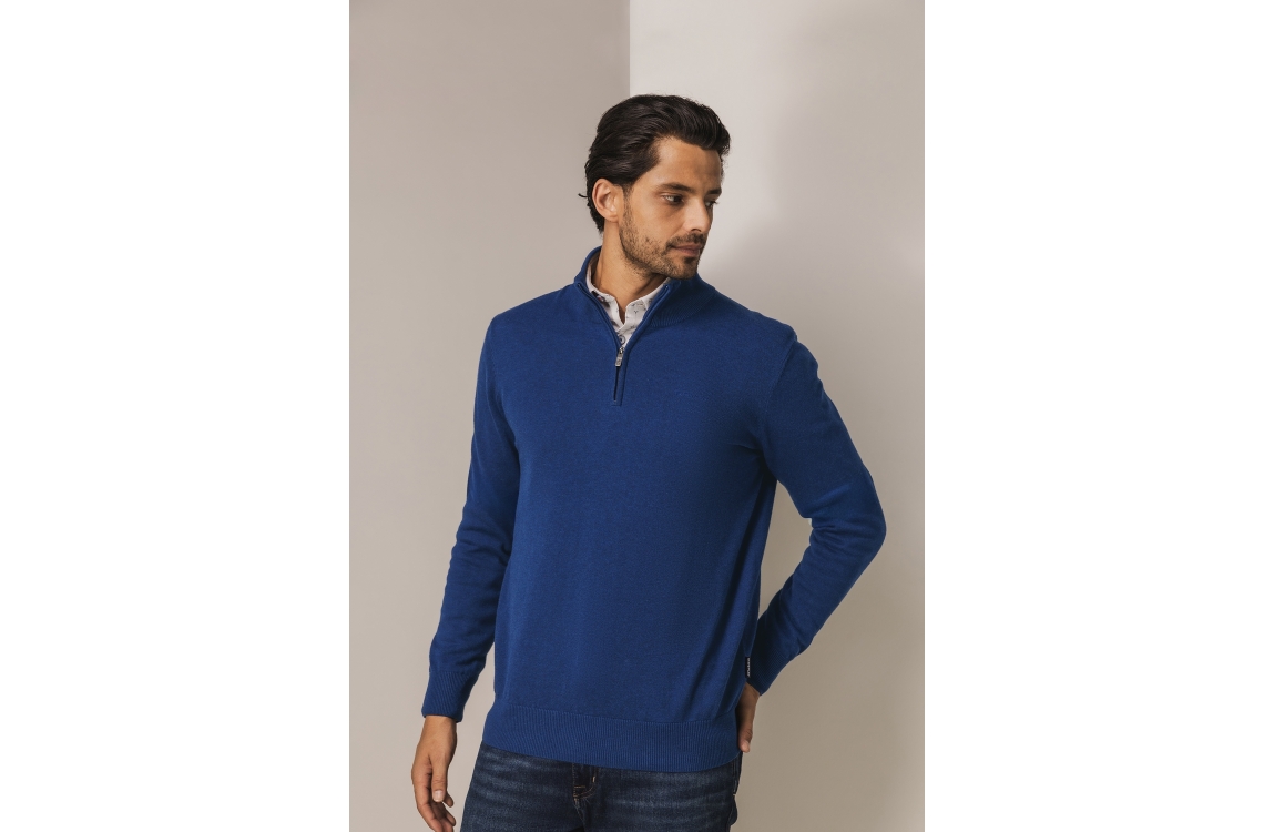 State of Art Pullover Sportzip Pl 5700 Kobalt. Dit rechtvallende model heeft een opstaande kraag met rits en lang en mouwen. Deze kobalt kleurige pullover van State of Art is afgewerkt met boorden.