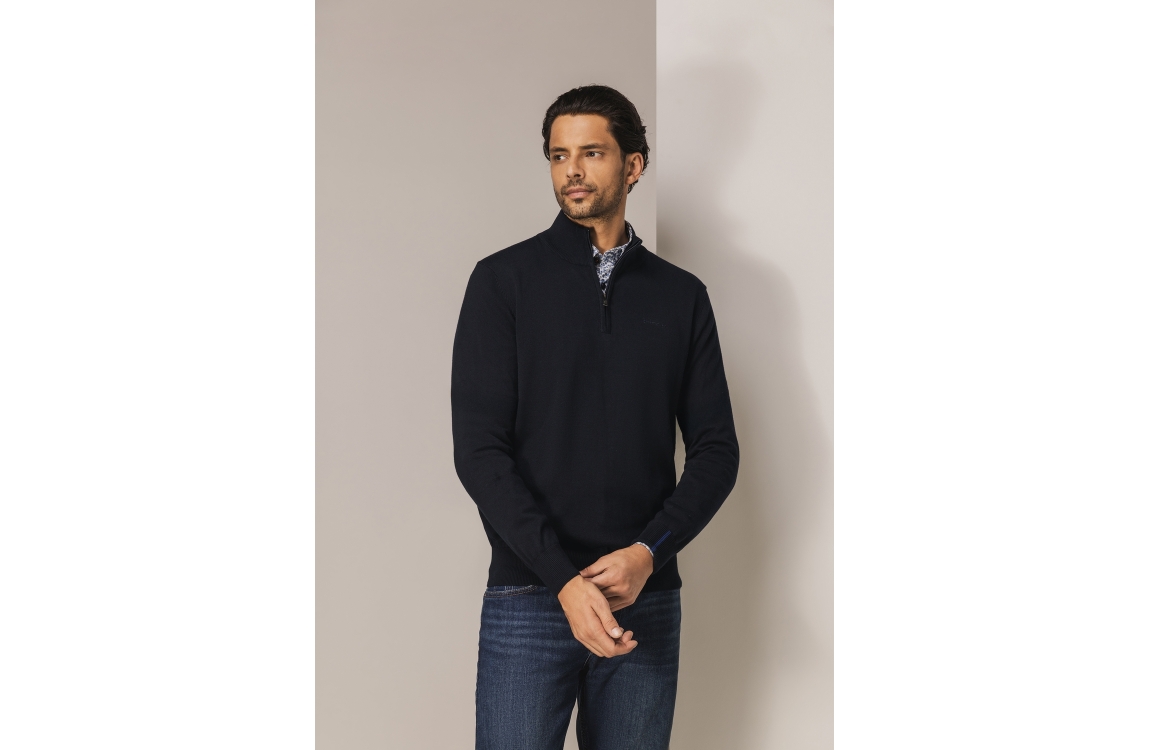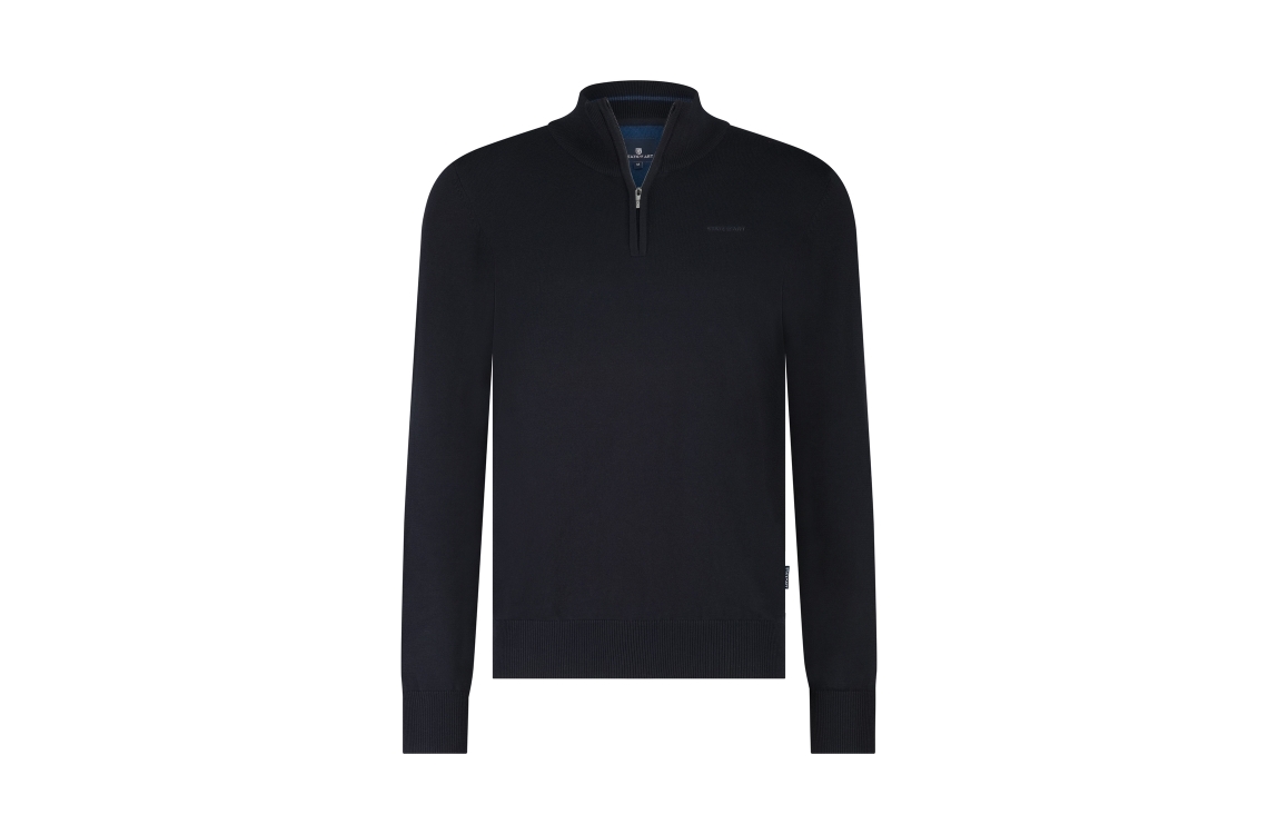 State of Art Pullover Sportzip Pl 5900 Donkerblauw. Dit rechtvallende model heeft een opstaande kraag met rits en lang en mouwen. Deze donker blauwe pullover van State of Art is afgewerkt met boorden.