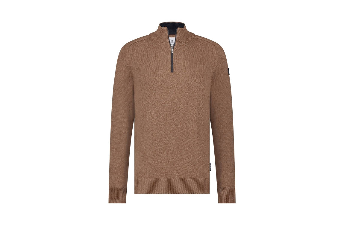 State of Art pullover 131-24021-8400. Dit rechtvallend model heeft een opstaande kraag met rits en lang en mouwen. Deze bruine pullover van State of Art is gedetailleerd met het merkembleem op de linkermouw en heeft afgewerkte boorden.