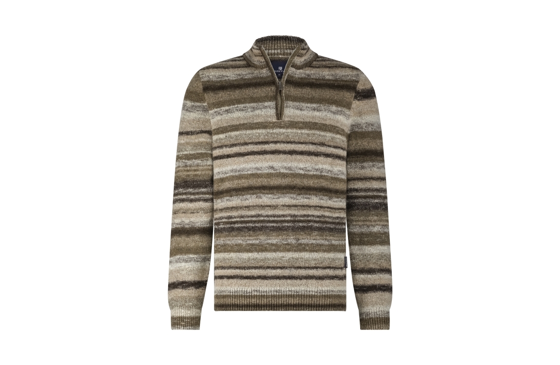 State of Art pullover 13225056. Dit rechtvallend model is voorzien van een opstaande kraag en heeft lange mouwen. Deze bruin/beige pullover van State of Art sluit aan de bovenzijde door middel van een rits en is all-over gemeleerd uitgevoerd.