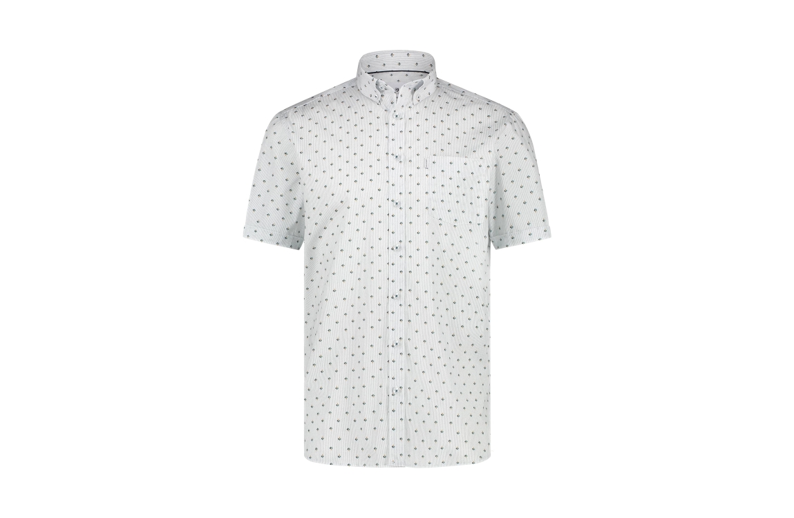 State of Art shirt 264-14235-1155. Dit rechtvallende model is voorzien van een kraag en heeft korte mouwen. Dit blauwe shirt van State of Art is bewerkt met een all-over verticale streep voorzien van kleine elementen.