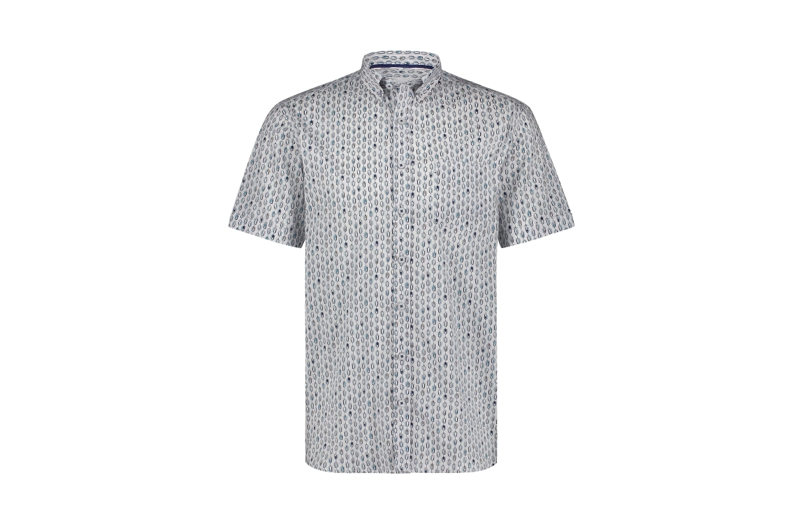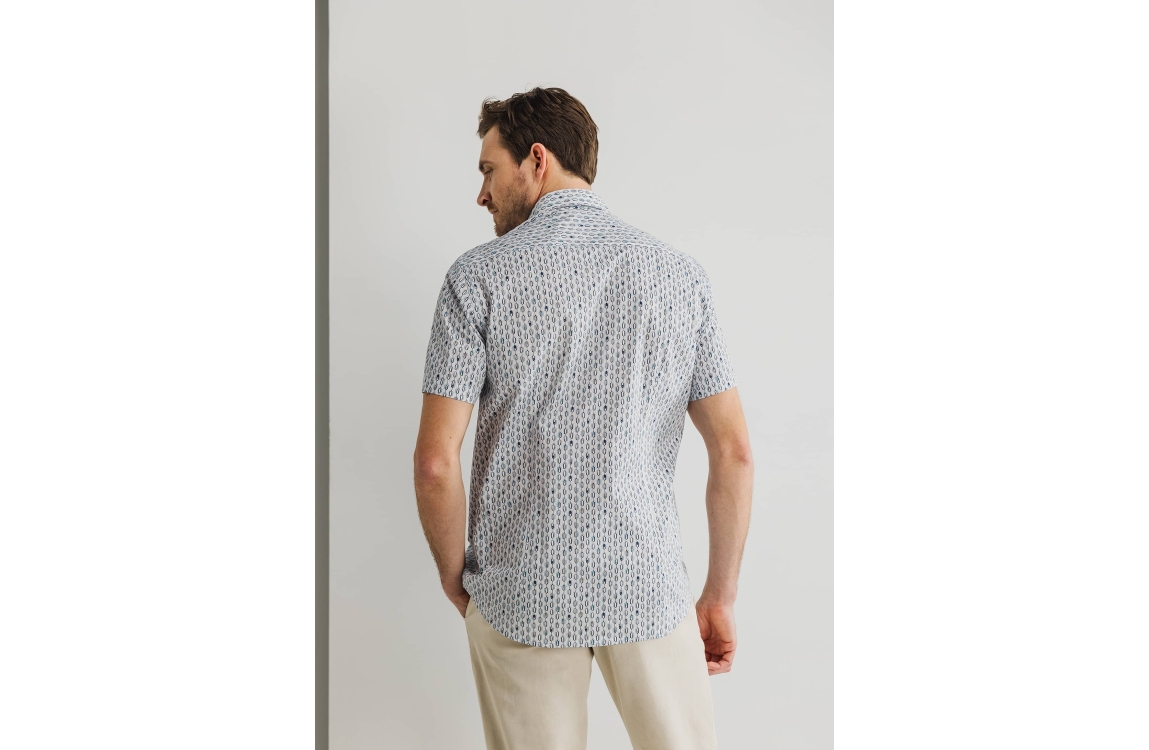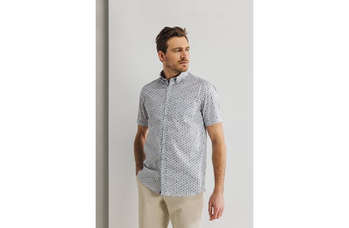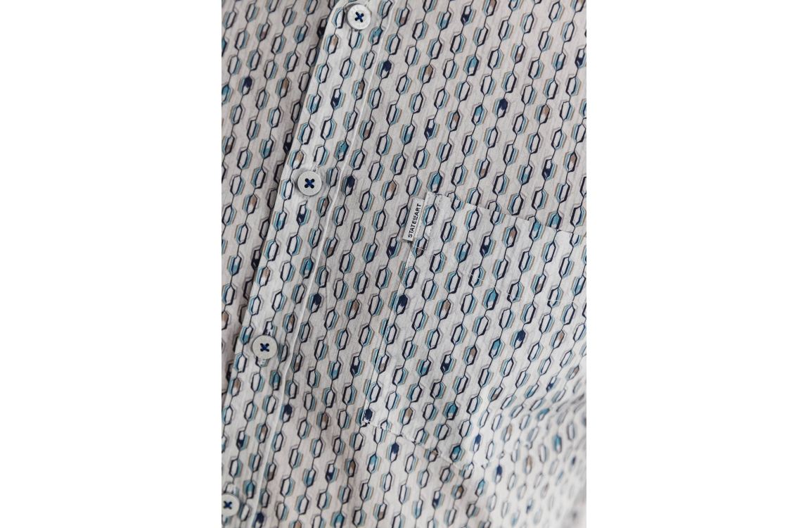 State of Art overhemd 26415181. Dit rechtvallende model is voorzien van een kraag en heeft korte mouwen. Dit witte overhemd van State of Art is sluitbaar doormiddel van knopen, heeft een grafisch patroon en heeft een borst zakje.