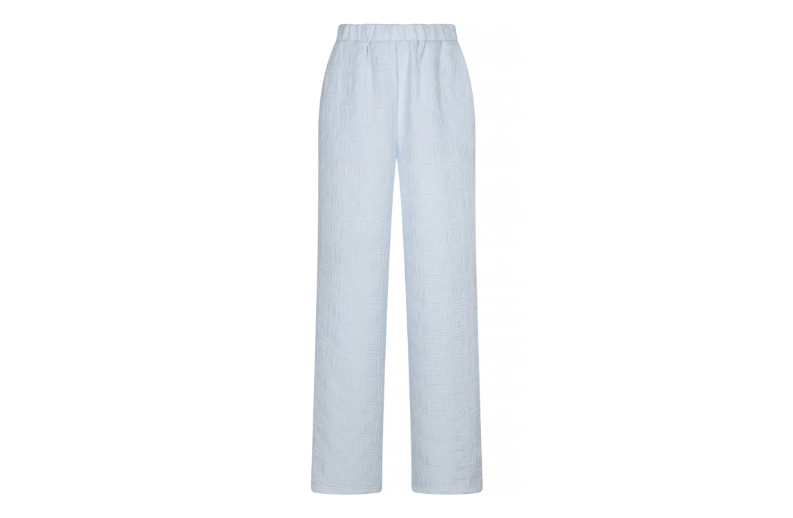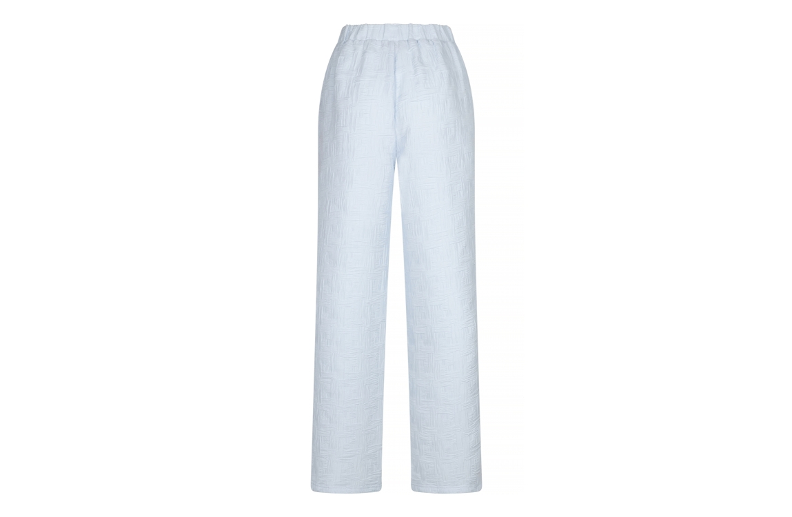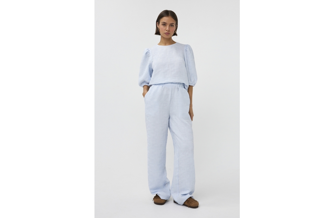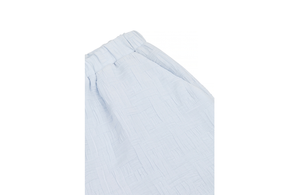 Studio Amaya broek Isabeau 261-ST13 402. Dit wide fit model sluit door middel van een elastische boord. Deze lichtblauwe broek van Studio Amaya is voorzien van twee steekzakken aan de voorzijde en is uitgevoerd met een structuur.