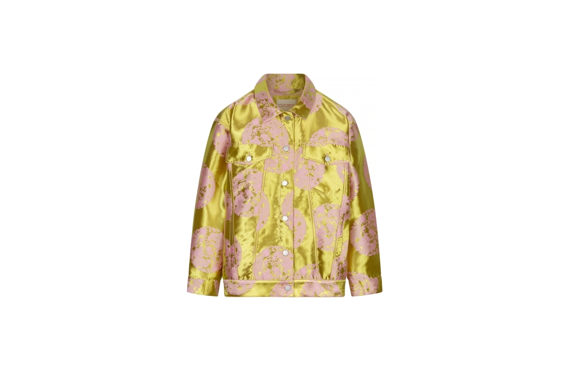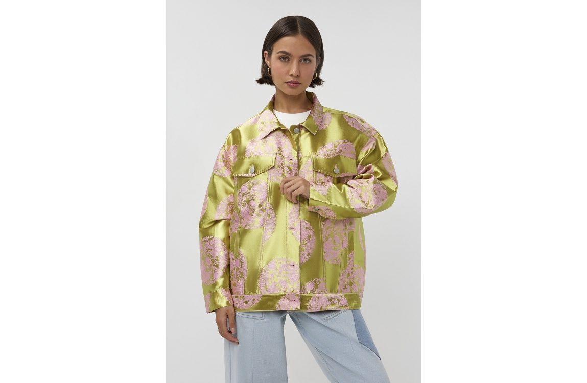 Studio Amaya jasje Joni 261-ST14 650. Dit oversized model heeft een kraag en lange mouwen. Het goudkleurige jasje van Studio Amaya sluit aan de voorzijde door middel van knopen en is all-over bewerkt met een rozekleurige grafische print. Het model is voorzien van twee sluitbare borstzakken en twee decoratieve steekzakken.