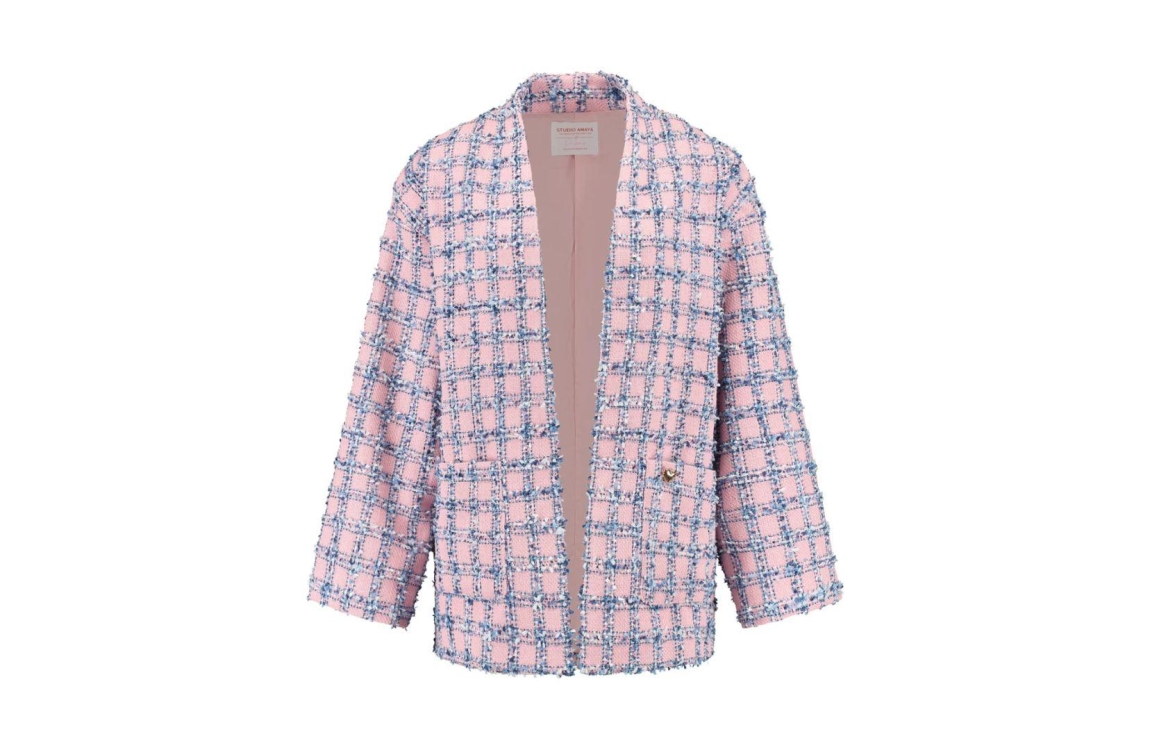 Studio Amaya clueless jacket 252-collab5. Dit oversized model is voorzien van een ronde hals en heeft lange mouwen. Deze roze jacket van Studio Amaya heeft twee steekzakken aan de voorzijde en op de linker zak een gouden hartjes detail. Dit model is uitgevoerd in een boucle stof in een mix van roze, wit, blauw en zilvere kleuren.