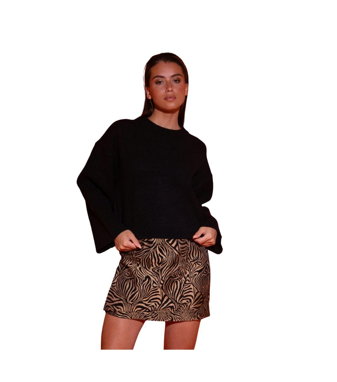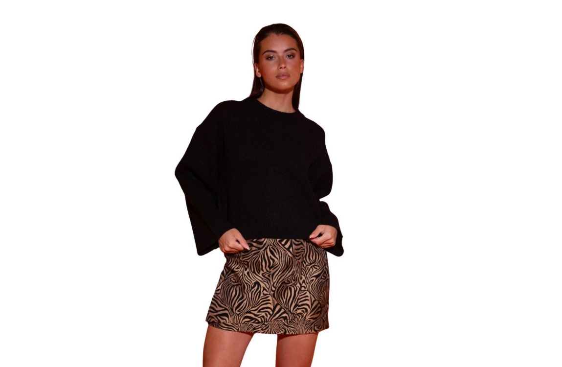Studio Amaya trui Diana 254-29. Dit rechtvallend zwarte model is voorzien van een ronde hals en heeft wijde lange mouwen.