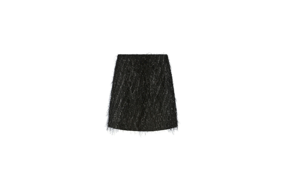 Studio Amaya rok 254-17. Dit aangesloten model sluit aan de zijkant door middel van een blinde rits. Deze zwarte rok van Studio Amaya is bewerkt met glinsterende franjes.