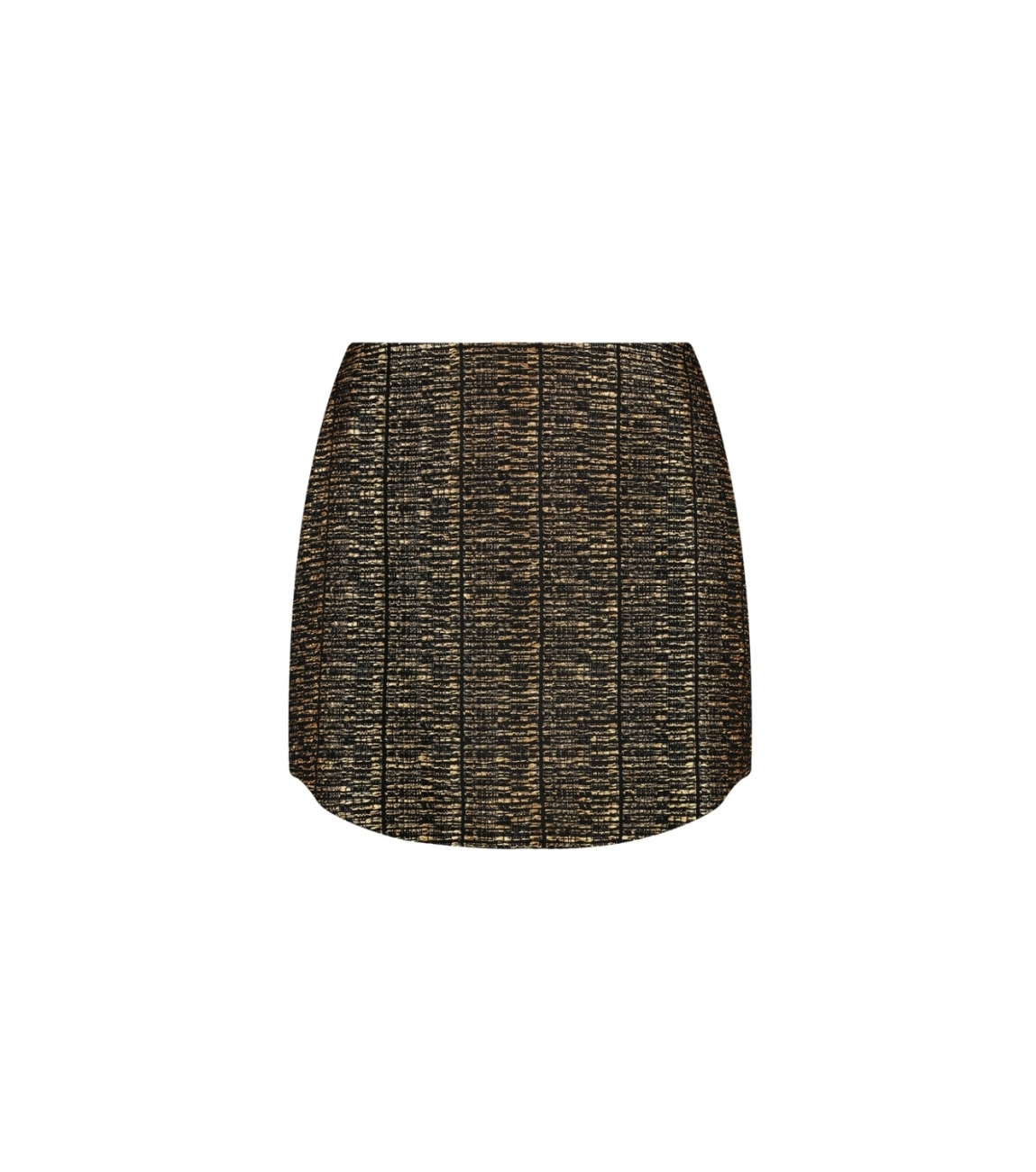 Studio Amaya rok Eliza 254-28. Dit aangesloten model loopt voor en achter rond af. Deze zwarte/bruine rok is gestructureerd uitgevoerd.