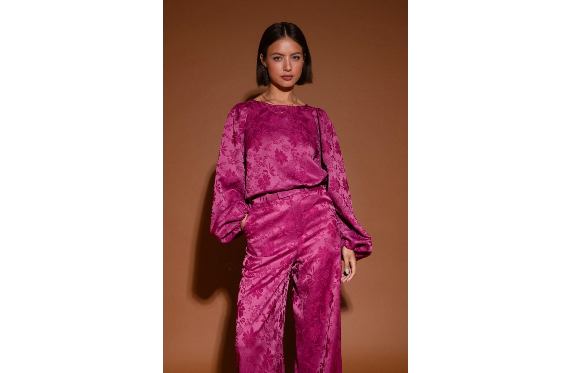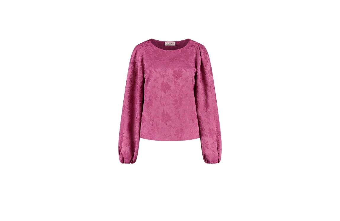 Studio Amaya blouse 253-11. Dit rechtvallend model is voorzien van een ronde hals en heeft lange ballonmouwen afgewerkt met elastische boorden. Deze fuchsiakleurige blouse van Studio Amaya is bewerkt met gestructureerde bloemen.