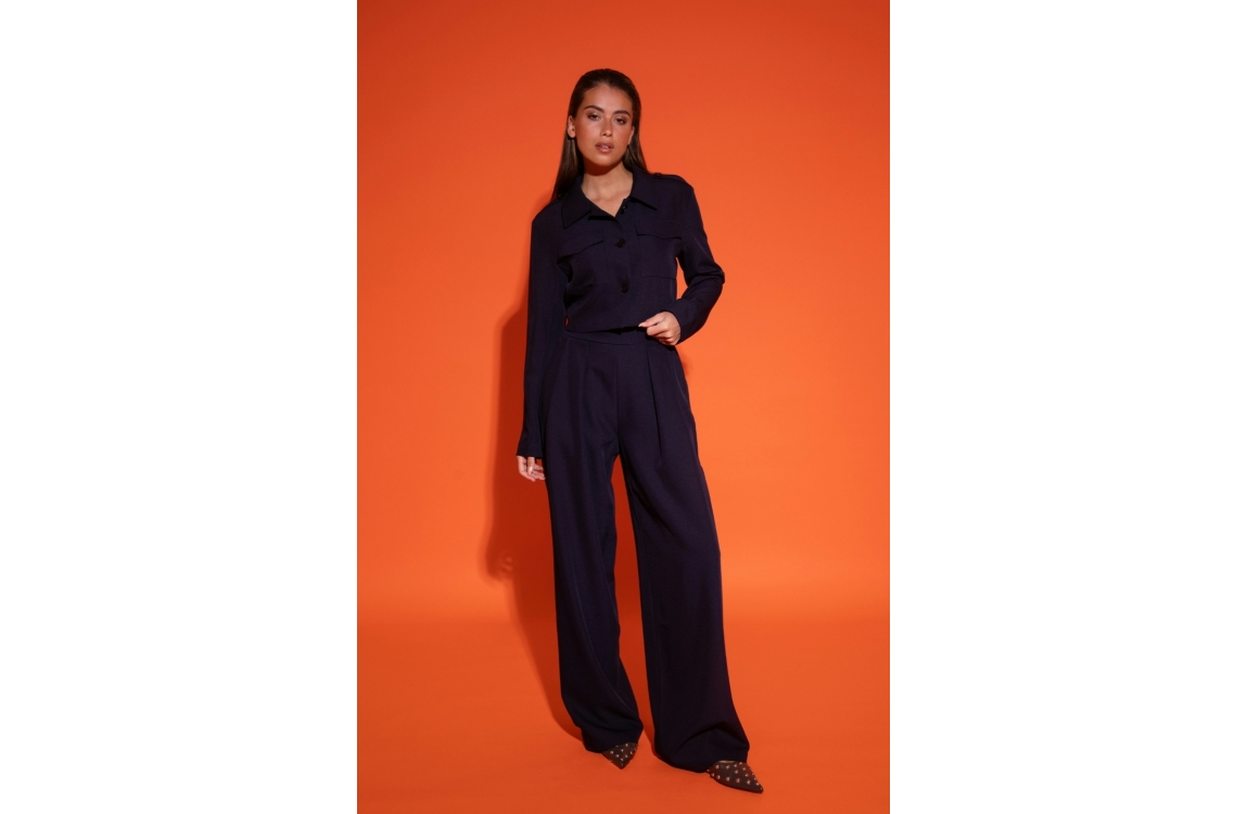 Studio Amaya broek Jasmin 254-11. Dit wide leg model sluit door middel van een elastische boord en beschikt over twee steekzakken aan de voorzijde. Deze donkerblauwe broek van Studio Amaya is bewerkt met plooidetails aan de voorzijde.