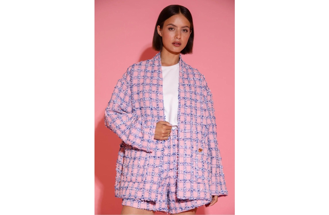 Studio Amaya legally blond short 252-collab6. Dit rechtvallende model sluit door middel van een rits. Deze roze short van Studio Amaya beschikt over twee steekzakken en een half hoge taille. Dit model is uitgevoerd in een boucle stof en is een mix van kleuren; roze, wit, blauw en zilver.