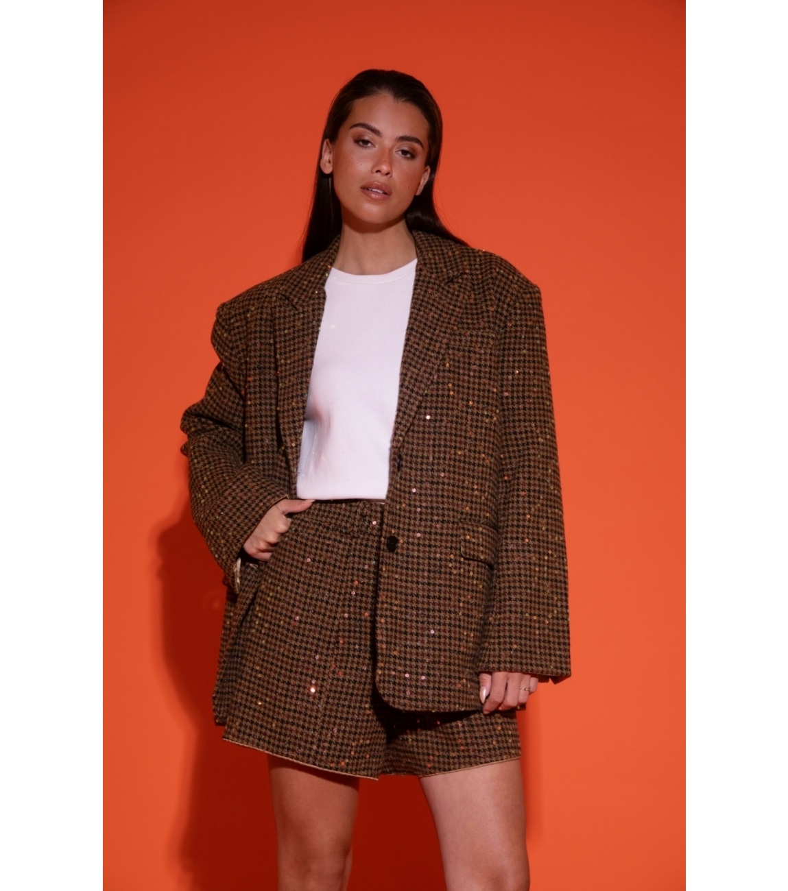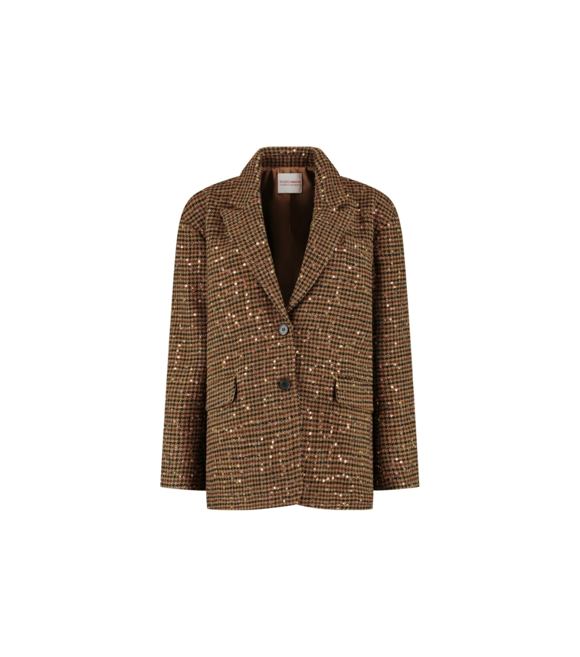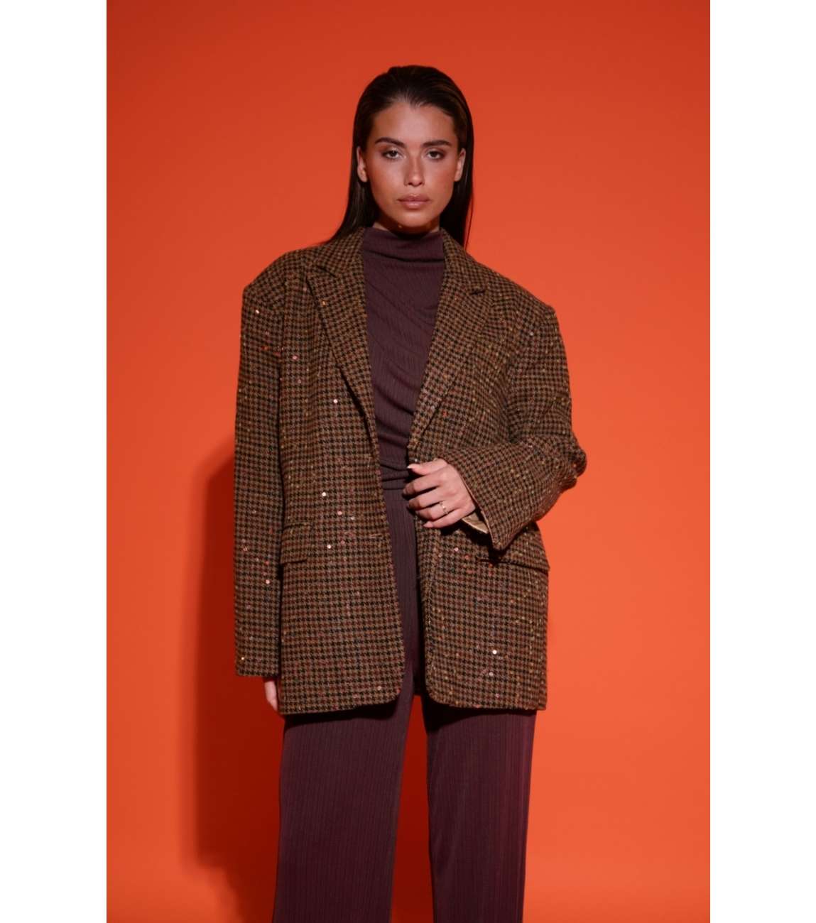 Studio Amaya blazer Midnight 254-7. Dit oversized model beschikt over een reverskraag en heeft lange mouwen. Deze bruine blazer van Studio Amaya sluit door middel van knopen en beschikt over twee klepzakken. Dit model is bewerkt met een ruitpatroon en is afgewerkt met pailletten.