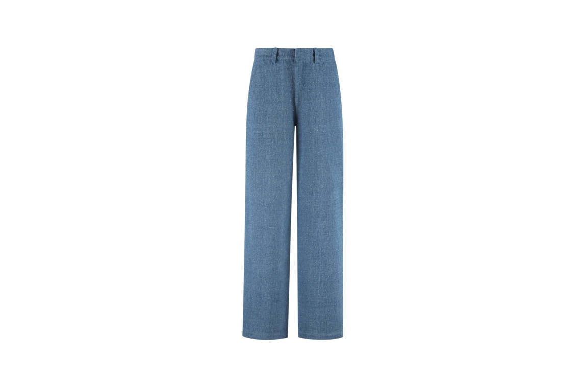 Studio Amaya broek Mies 253-58. Dit wide leg model sluit door middel van een knoop en rits afgewerkt met ceintuurlussen. Deze denim broek van Studio Amaya is voorzien van twee steekzakken aan de voorzijde en twee paspelzakken aan de achterzijde. Dit model is all-over bewerkt met strass steenjes. Combineer deze broek met de Jack jacket voor een set.