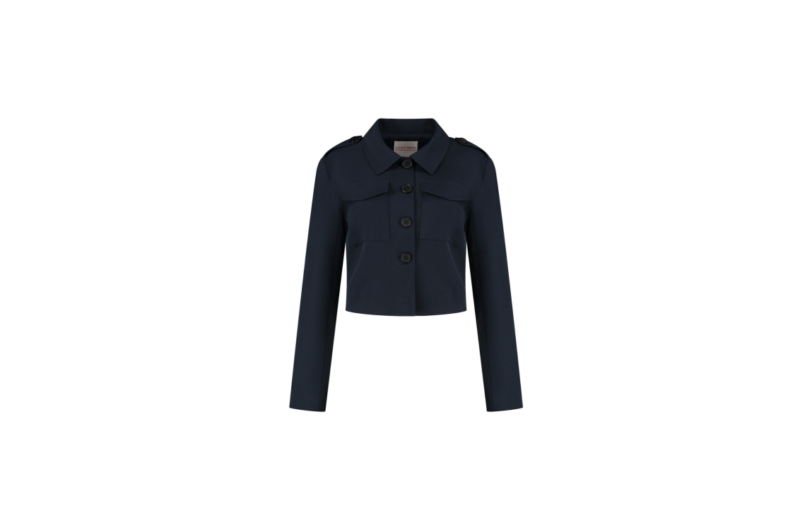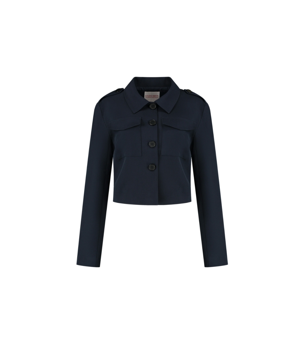 Studio Amaya jasje snow 254-9. Dit rechtvallend korte model is voorzien van een kraag en heeft lange mouwen. Dit donkerblauwe jasje van Studio Amaya sluit door middel van knopen en beschikt over twee borstzakken.