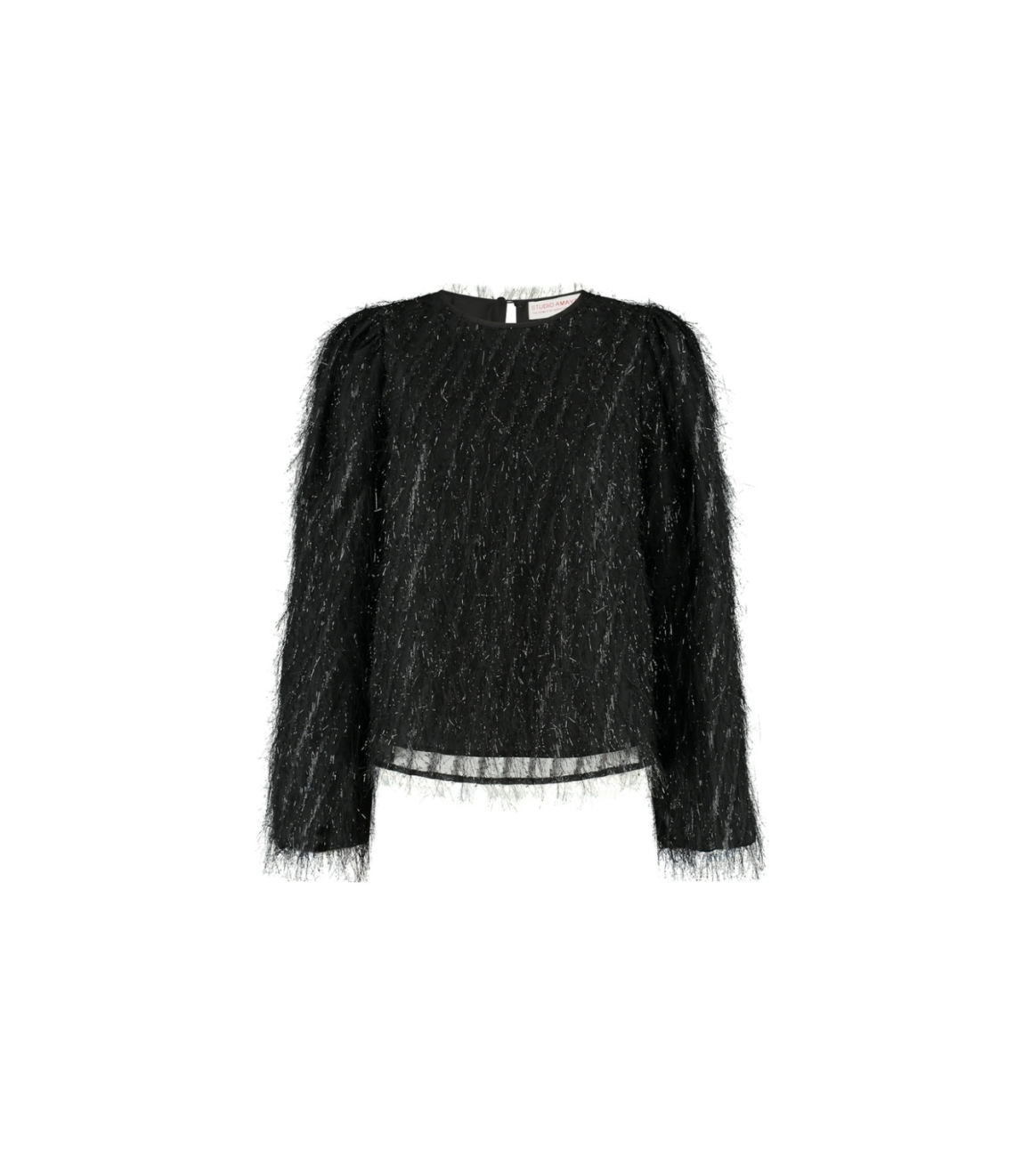 Studio Amaya blouse velvet. Dit rechtvallend model is voorzien van een ronde hals en heeft lange mouwen. Deze zwarte top van Studio Amaya is bewerkt met glinsterende franjes en beschikt over schoudervulling. Dit model sluit aan de achterzijde door middel van een knoopje.