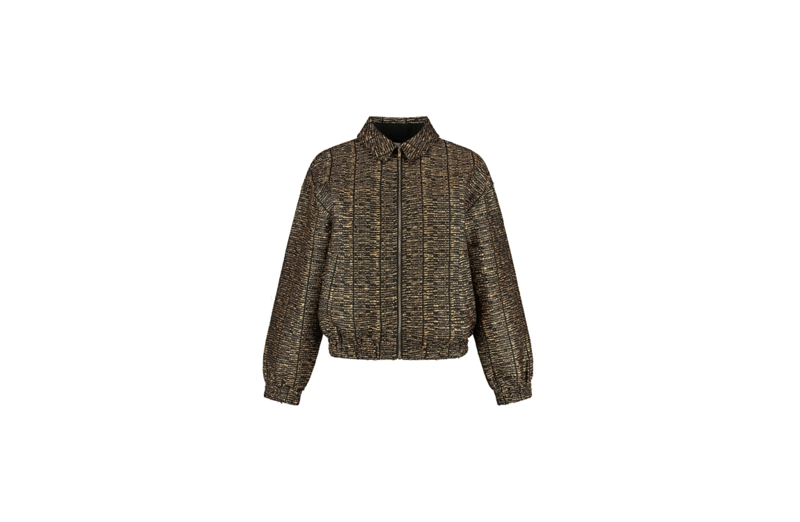 Studio Amaya jack Victoria 254-27. Dit bomber model is voorzien van een ronde hals en heeft lange mouwen. Deze zwart/bruine jack van Studio Amaya sluit door middel van een rits en is gestructureerd uitgevoerd.