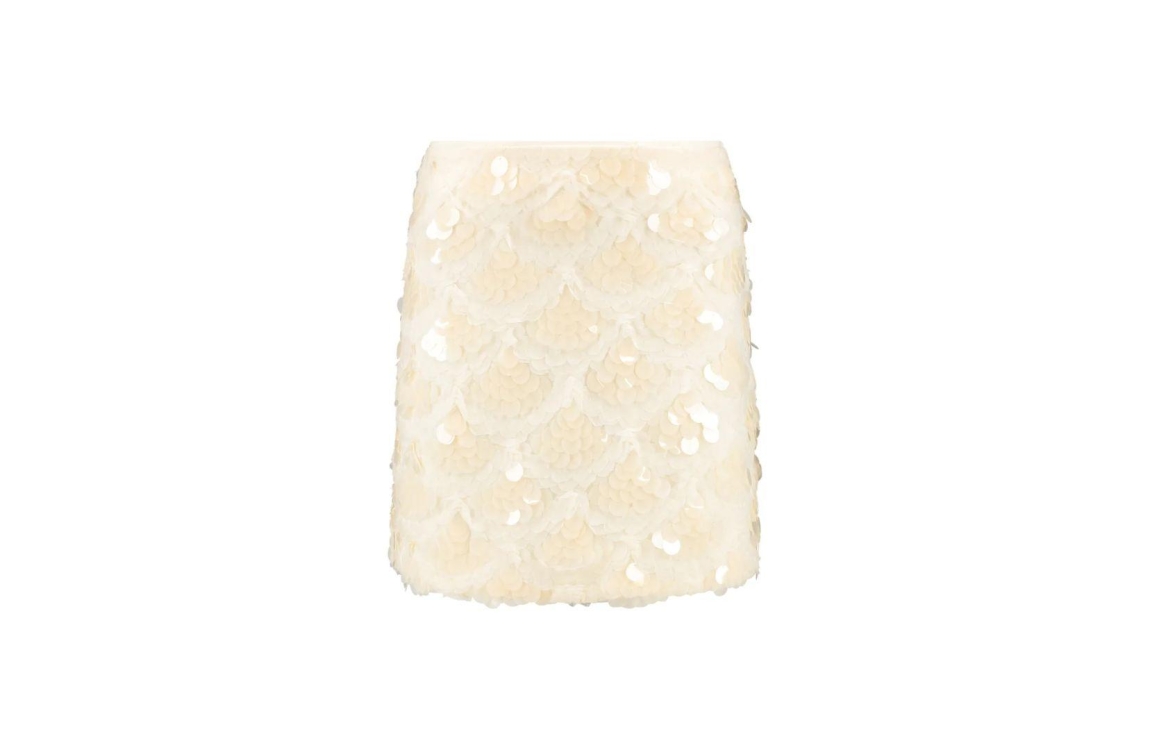 Studio Amaya What Happens in Vegas Rok 252-collab8. Dit aangesloten model is sluit door middel van een blinde rits aan de zijkant. Deze beige rok van Studio Amaya is all over bedekt met pailletten.