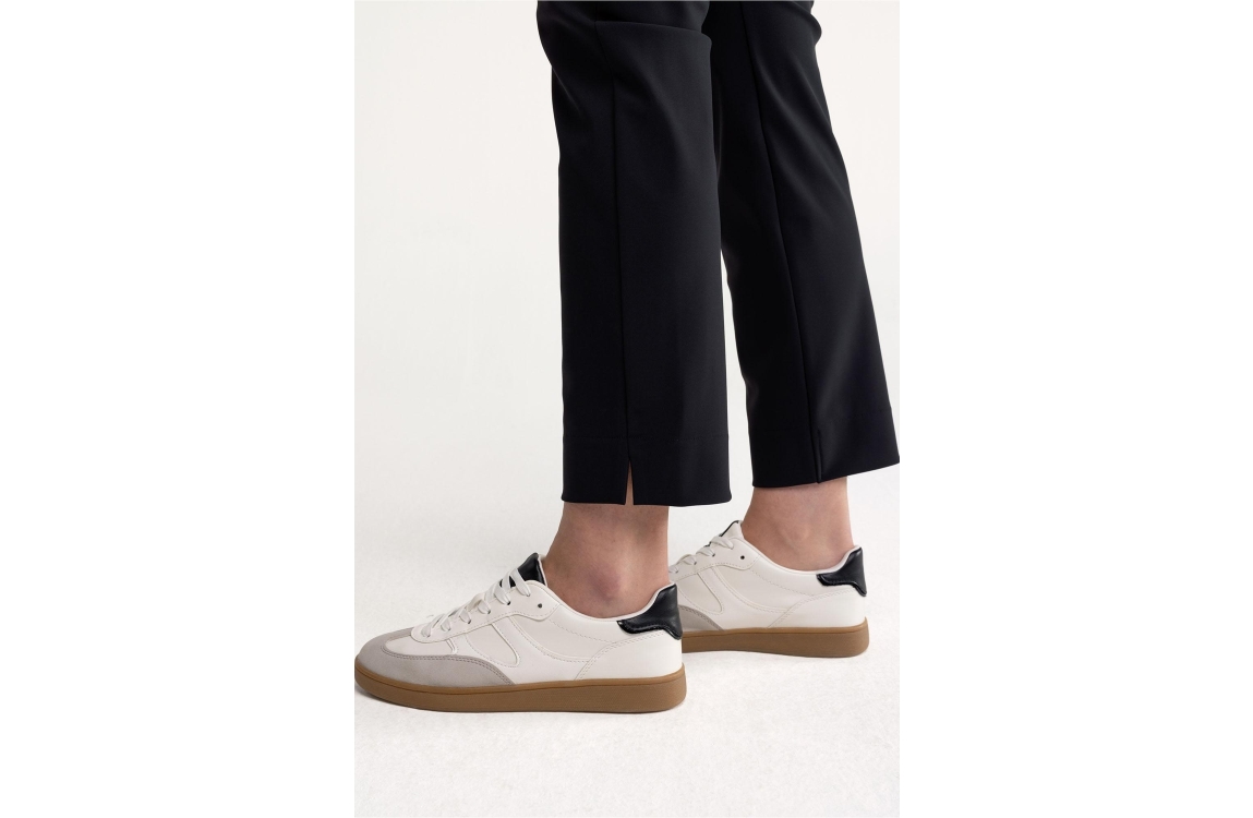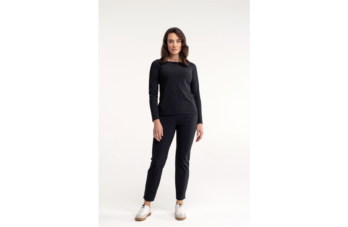 Studio Anneloes Anne bonded trousers 94819. Dit tapered fit model sluit aan de bovenzijde door middel van een elastische tailleband met riemlusjes. Deze zwarte broek van Studio Anneloes is voorzien van steekzakken, fake paspelzakken achter en heeft splitjes in de zoom.