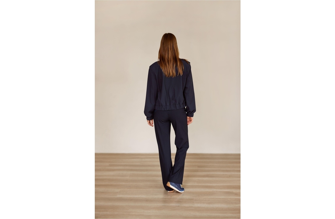 Studio Anneloes Benja bomber jacket 6900 94844. Dit oversized model heeft een ronde hals en lange mouwen. Dit donkerblauwe bomberjasje van Studio Anneloes sluit door middel van een rits, heeft schuine steekzakken en is gemaakt van travel materiaal.