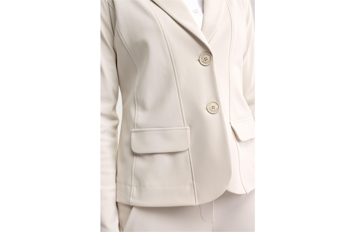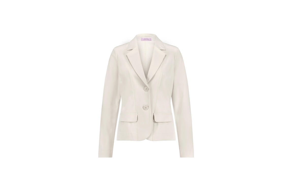 Studio Anneloes Bright bonded blazer 94811. Dit aangesloten model is voorzien van een revers kraag en heeft lange mouwen. Deze kit kleurige korte blazer van Studio Anneloes is aan de voorzijde voorzien van twee knopen en fake klepzakken. Dit model is uitgevoerd in een elastische kwaliteit.