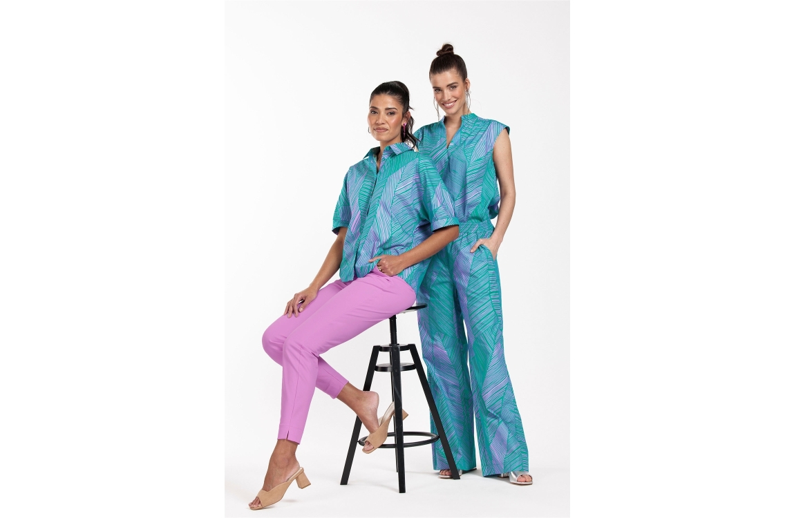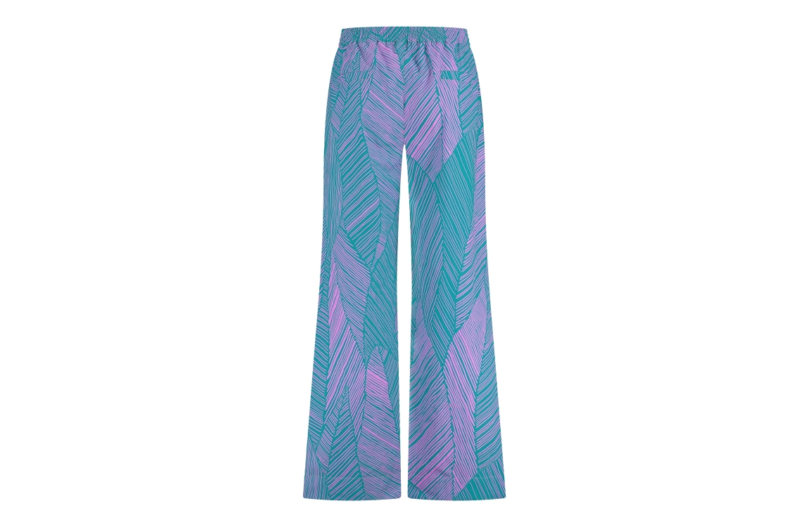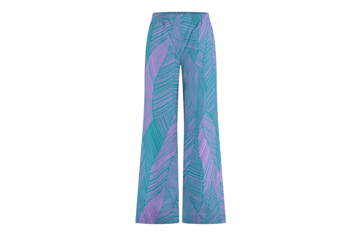 Studio Anneloes broek Doro. Dit wijdvallende model is voorzien van een elastische tailleband en heeft lange pijpen. Deze groene broek van Studio Anneloes is bewerkt met een all-over bladmotief in een lila kleur. Dit model is uitgevoerd met twee schuine steekzakken aan de voorzijde en twee paspelzakken aan de achterzijde.