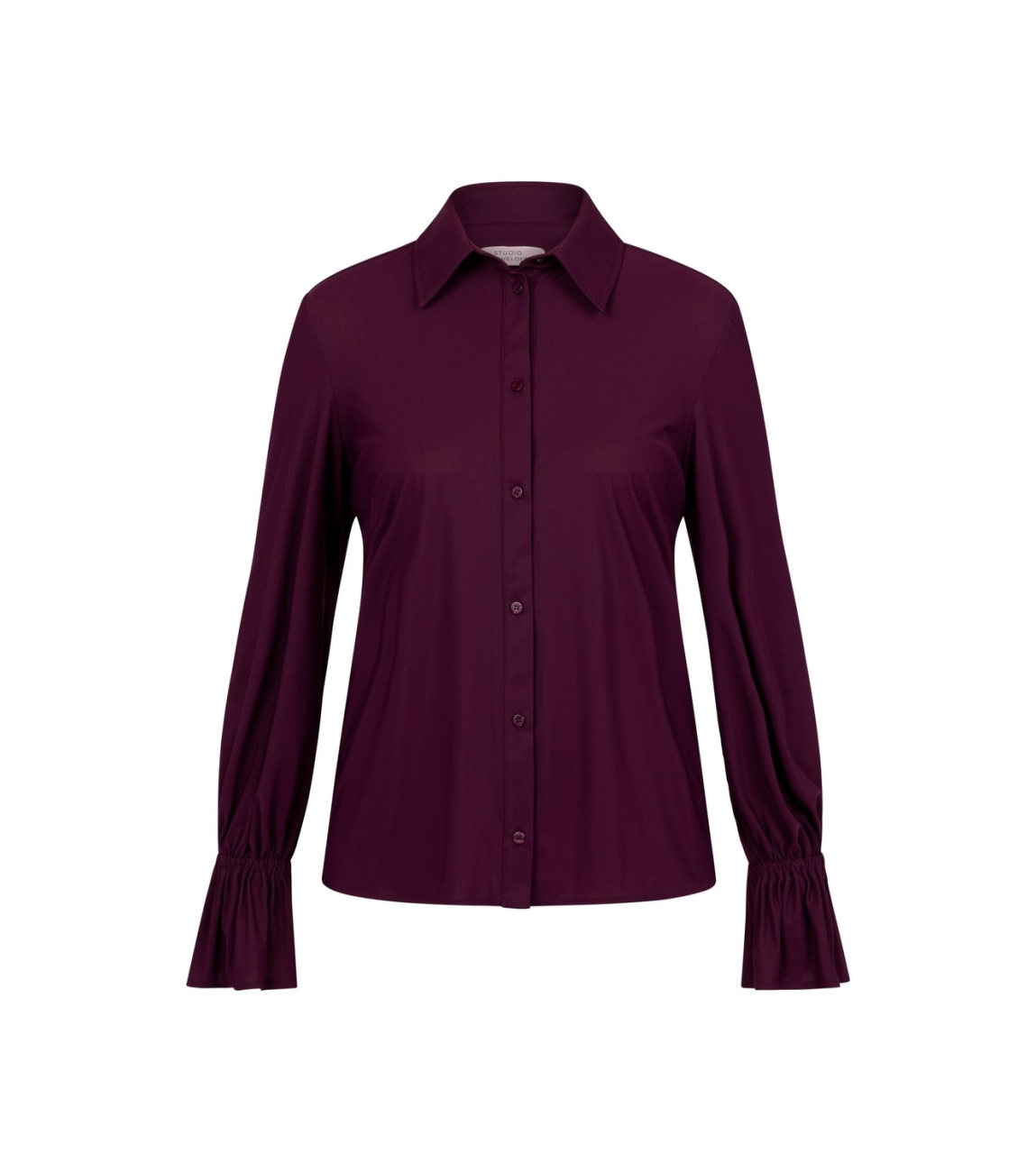 Studio Anneloes blouse Duna 13357. Dit rechtvallend model is voorzien van een kraag en heeft lange mouwen met ruffles. Deze donkerrode blouse van Studio Anneloes sluit door middel van knopen.