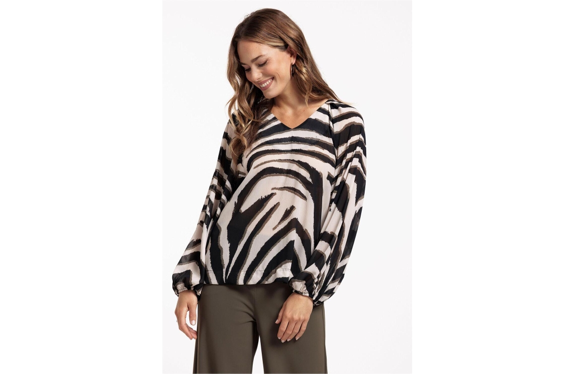 Studio Anneloes elian zebra crepe top. Dit soepelvallende model heeft een v-hals en ballon mouwen. Deze beige kleurige blouse van Studio Anneloes is voorzien van een zwart/groen zebra patroon.