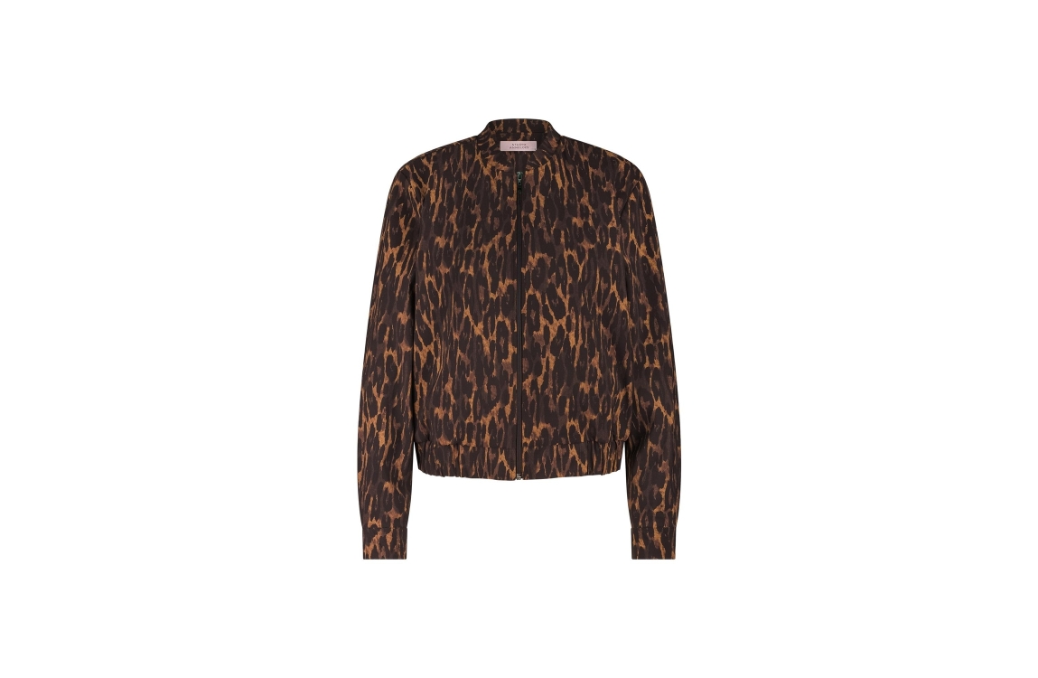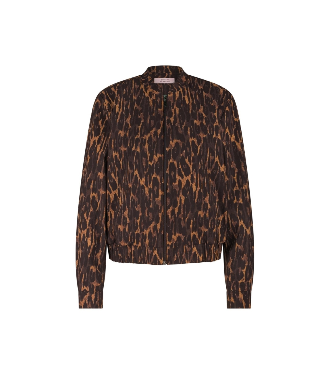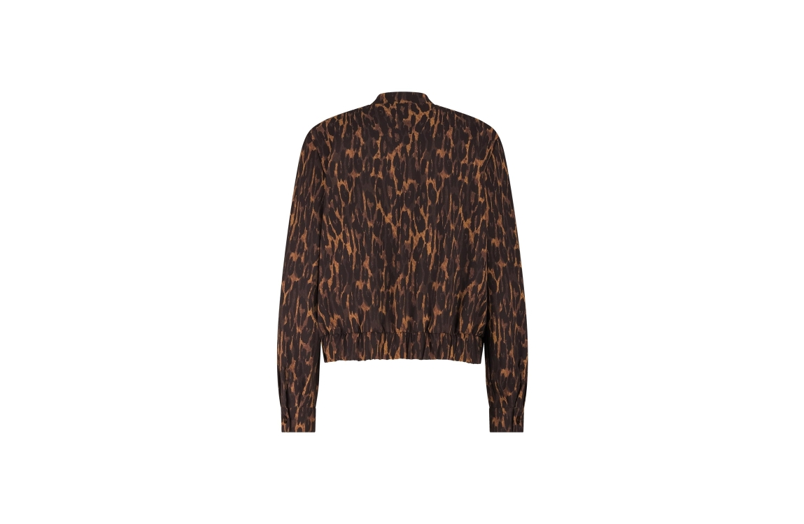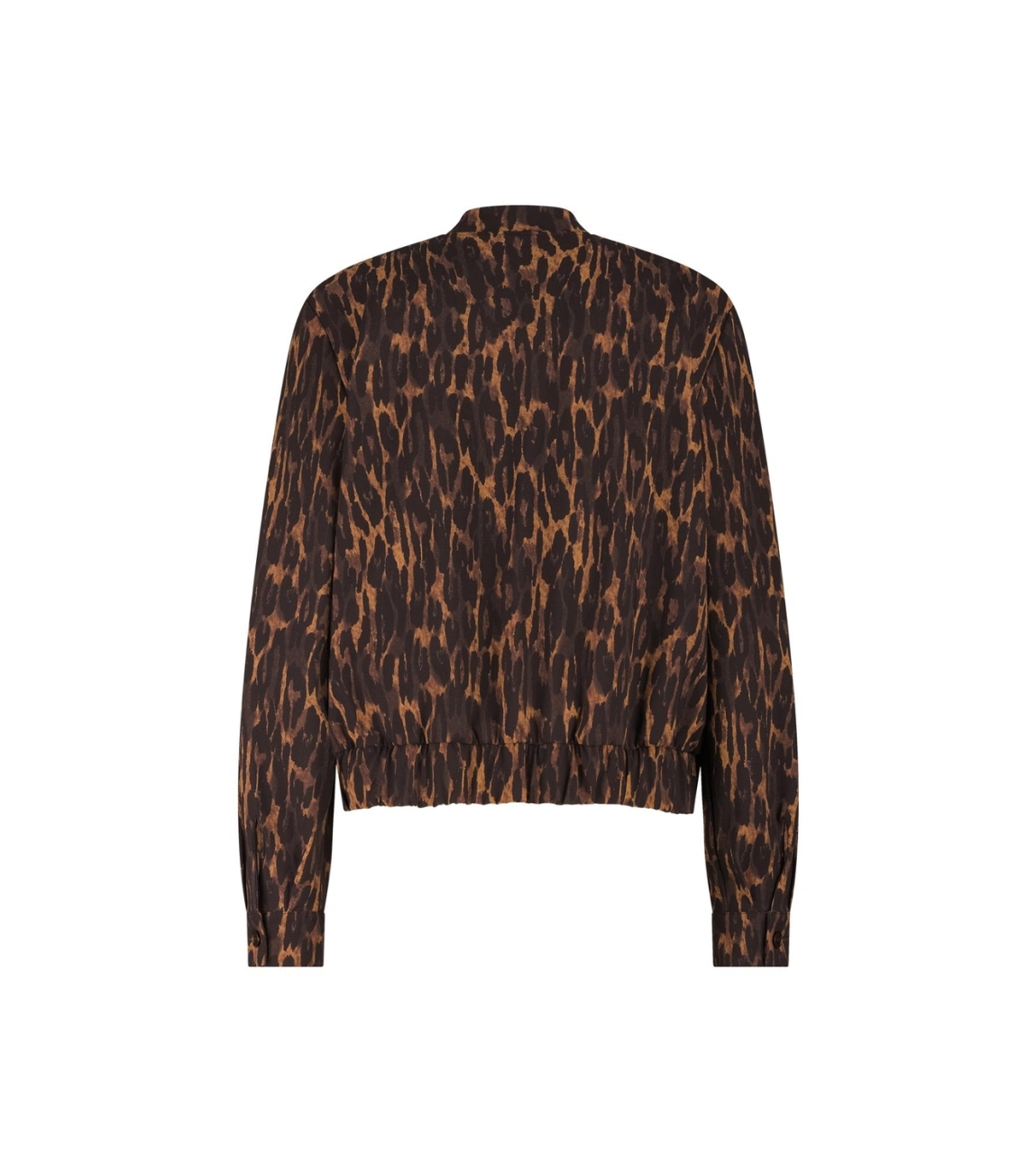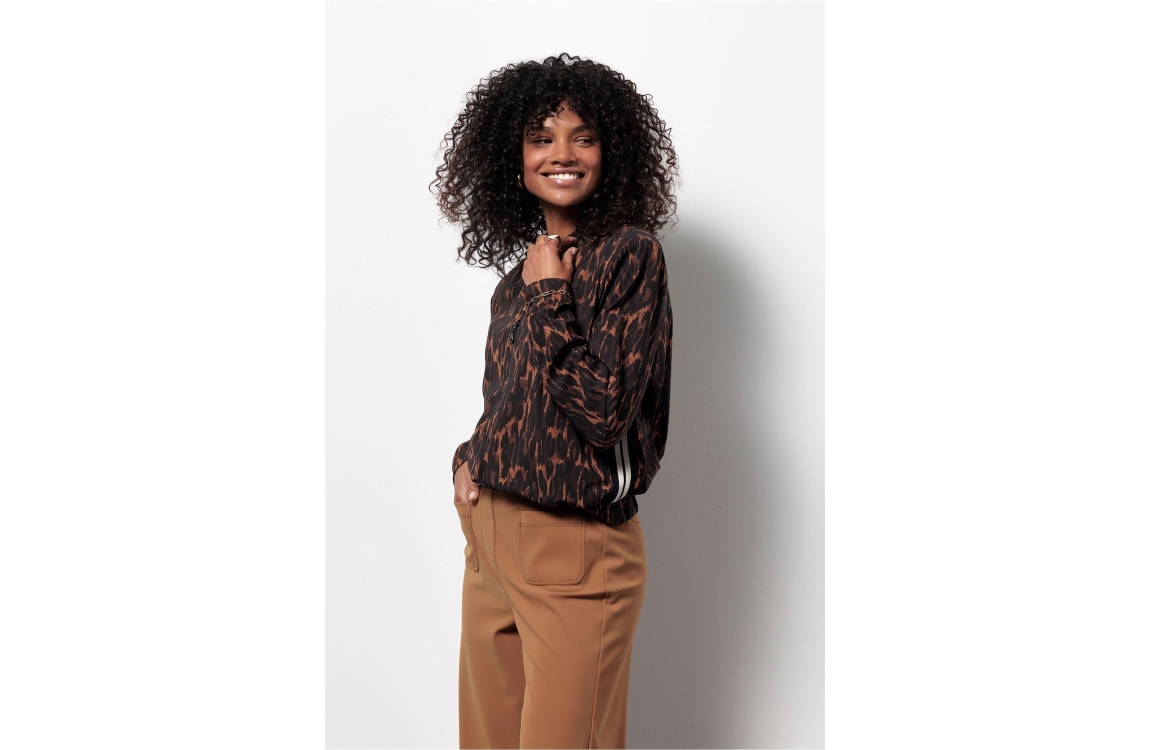 Studio Anneloes bomber jacket Elliot 13251. Dit wijdere model is voorzien van een ronde hals en heeft lange mouwen. Deze bruine bomber jacket van Studio Anneloes sluit door middel van een rits en beschikt over twee steekzakken. Dit model is bewerkt met panterprint en afgewerkt met zwart/witte biezen aan de zijkanten.