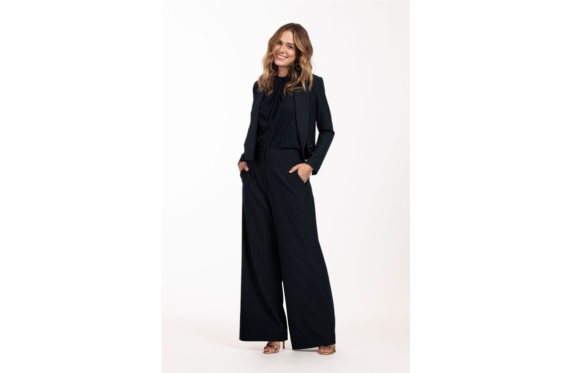 Studio Anneloes broek Holly 09255 6902 030. Dit straight fit model sluit door middel van een rits met knoop en is voorzien van twee steekzakken voor en fake paspelzakken achter. Deze blauwe broek van Studio Anneloes is all-over bewerkt met een lurex pinstripe.