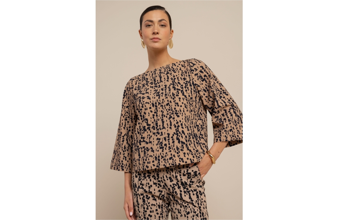 Studio Anneloes Ilja top 13505. Dit rechtvallend model heeft een ronde hals en wijduitlopende driekwart mouwen. Deze beige top van Studio Anneloes is bewerkt met een donkerblauwe grafische print.