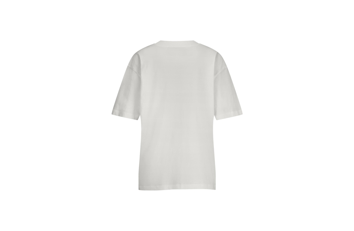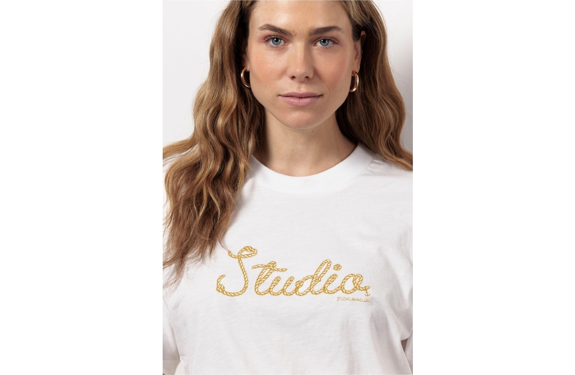 Studio Anneloes T-shirt Klaske Rope 12833 1100 030. Dit rechtvallend model heeft een ronde hals met ribgebreide boorden en korte mouwen. Deze off white T-shirt van Studio Anneloes is op het voorpand bewerkt met geborduurde 'Studio Anneloes' letters en is afgewerkt met een brede boord aan de zoom.