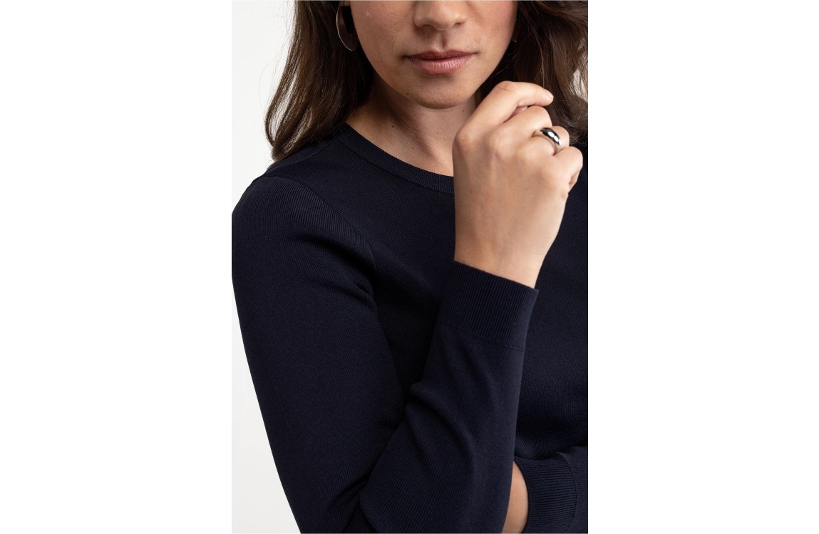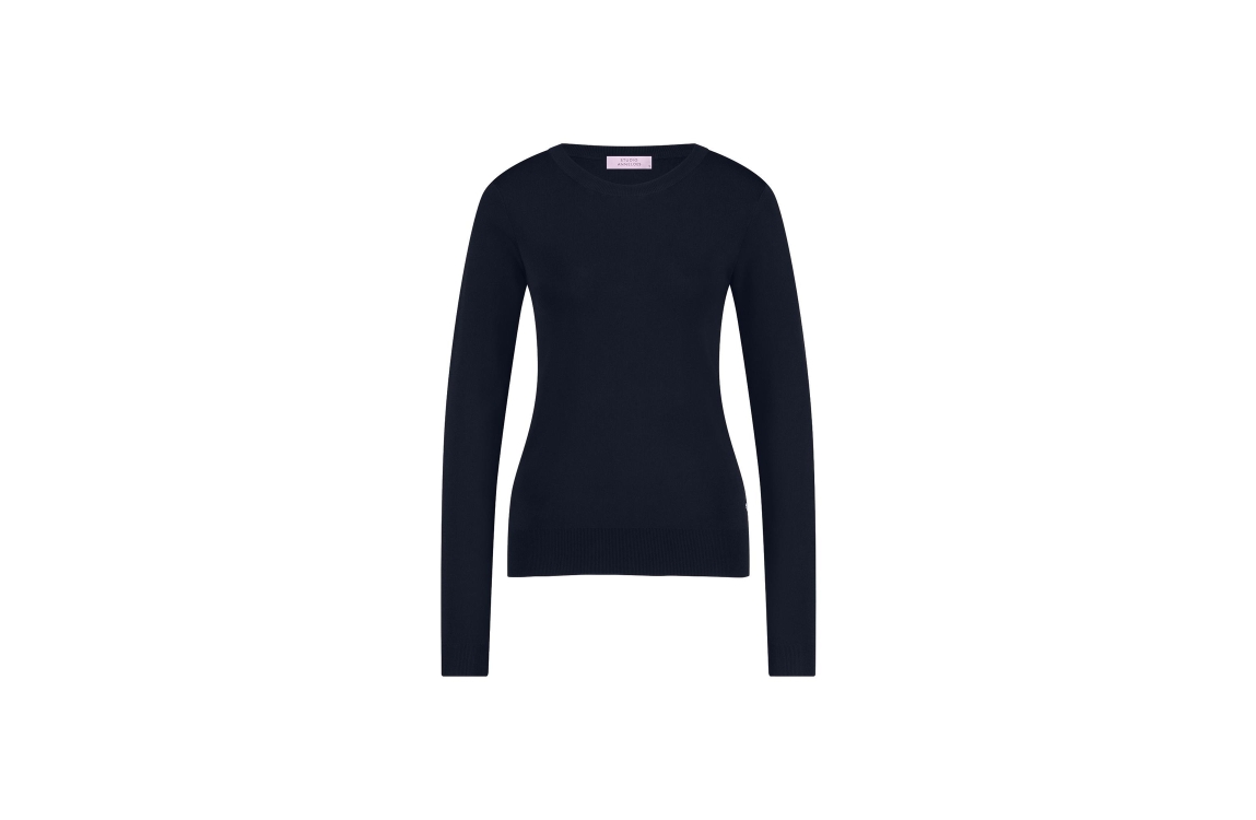 Studio Anneloes pullover Lana 91520. Dit aangesloten model heeft een ronde hals en lange mouwen. Deze donkerblauwe fijn gebreide pullover van Studio Anneloes heeft fijn gebreide boorden.