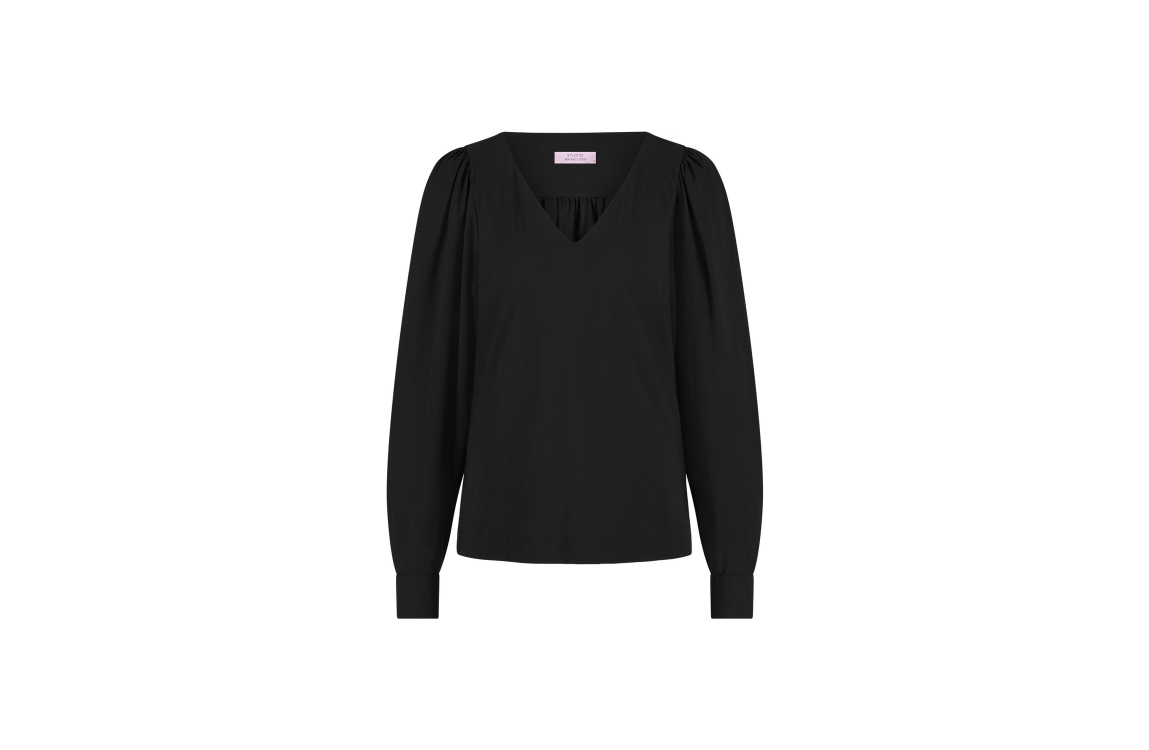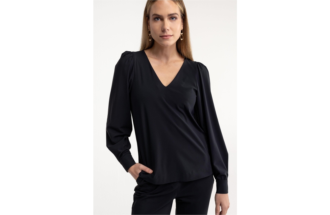 Studio Anneloes top Les 94821. Dit rechtvallend model is voorzien van een v-hals en heeft lange pofmouwen. Deze zwarte top van Studio Anneloes is uitgevoerd in een travel kwaliteit.