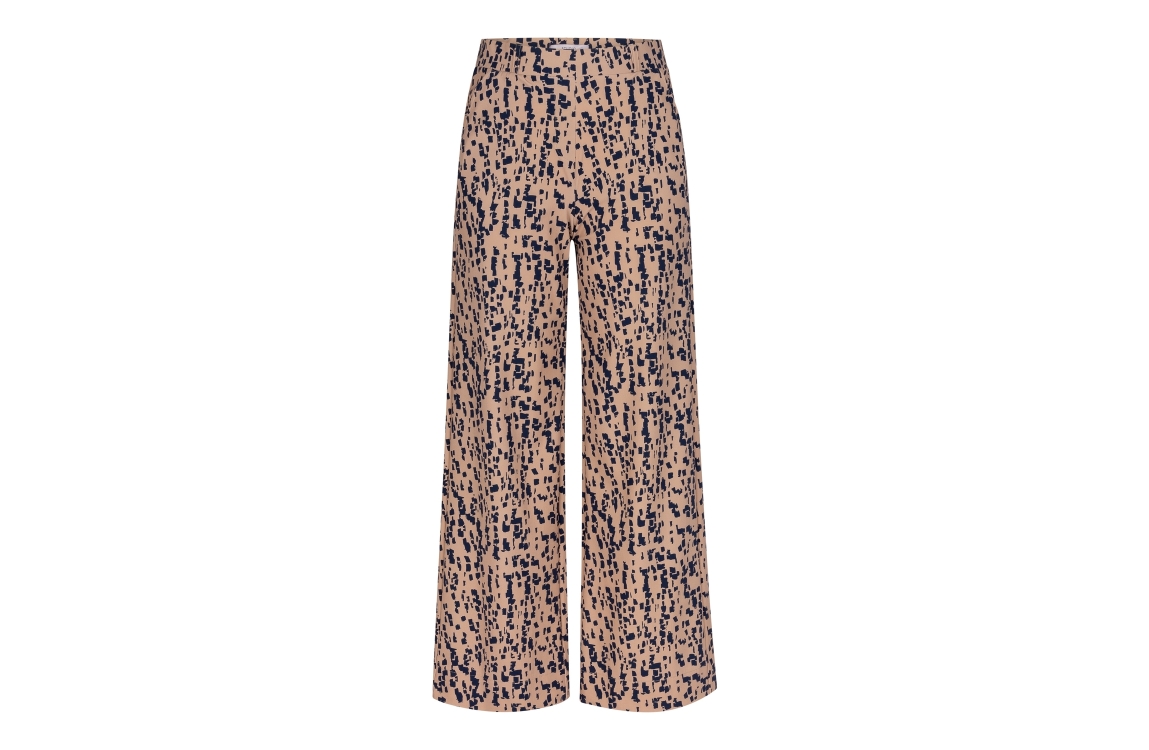Studio Anneloes Lexie broek 13507. Dit rechtvallend model sluit aan de bovenzijde door middel van een elastische boord. Deze beige broek van Studio Anneloes is bewerkt met een donkerblauwe grafische print en beschikt over schuine steekzakken.