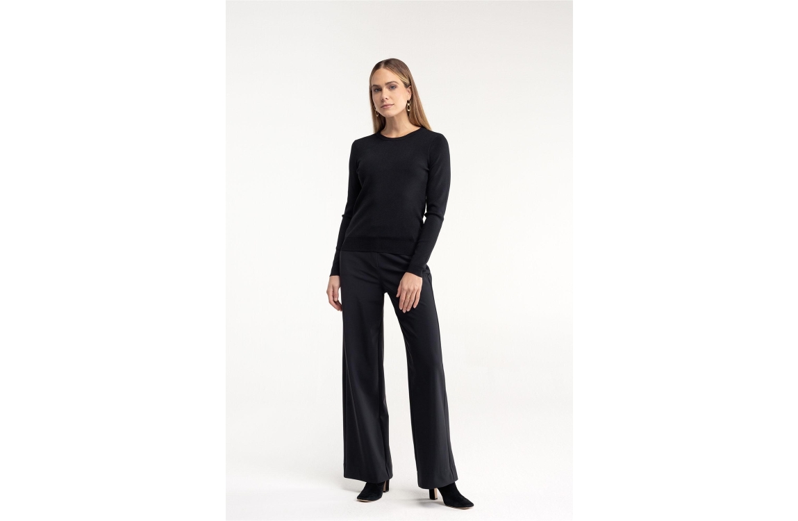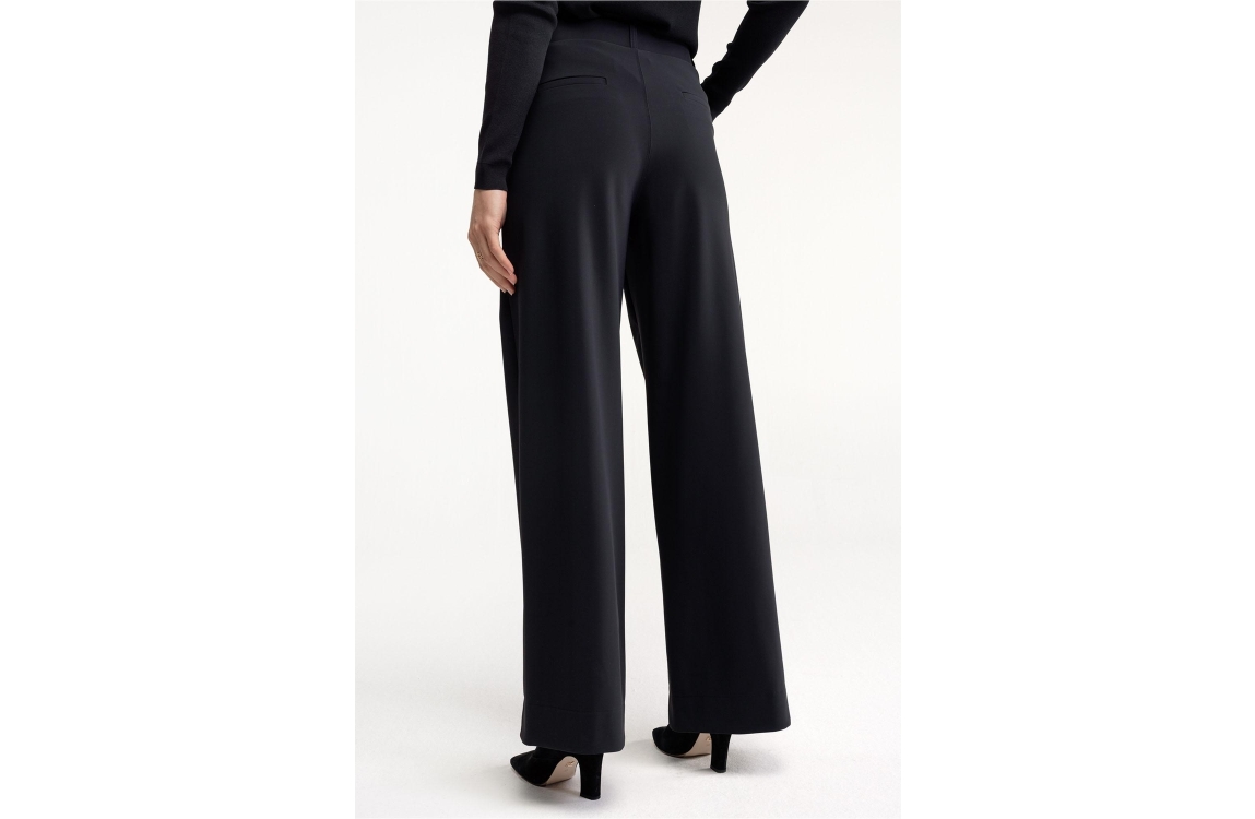 Studio Anneloes Lexie bonded trousers 94801. Dit wide fit model sluit aan de bovenzijde door middel van een elastische tailleband met riemlusjes. Deze zwarte broek van Studio Anneloes is voorzien van steekzakken, fake paspelzakken achter en heeft een brede zoom.